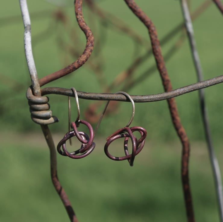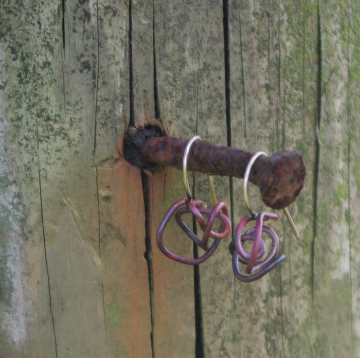 Inspired by the tangled and rusty fencing on my walk, I have soldered a copper squiggle of wire , onto a sterling silver hook .
