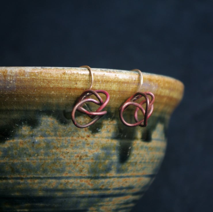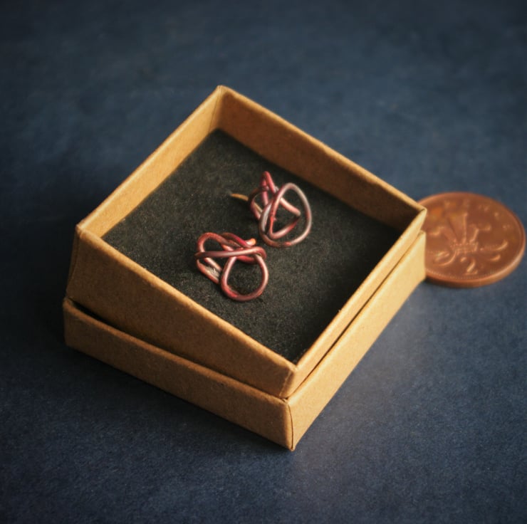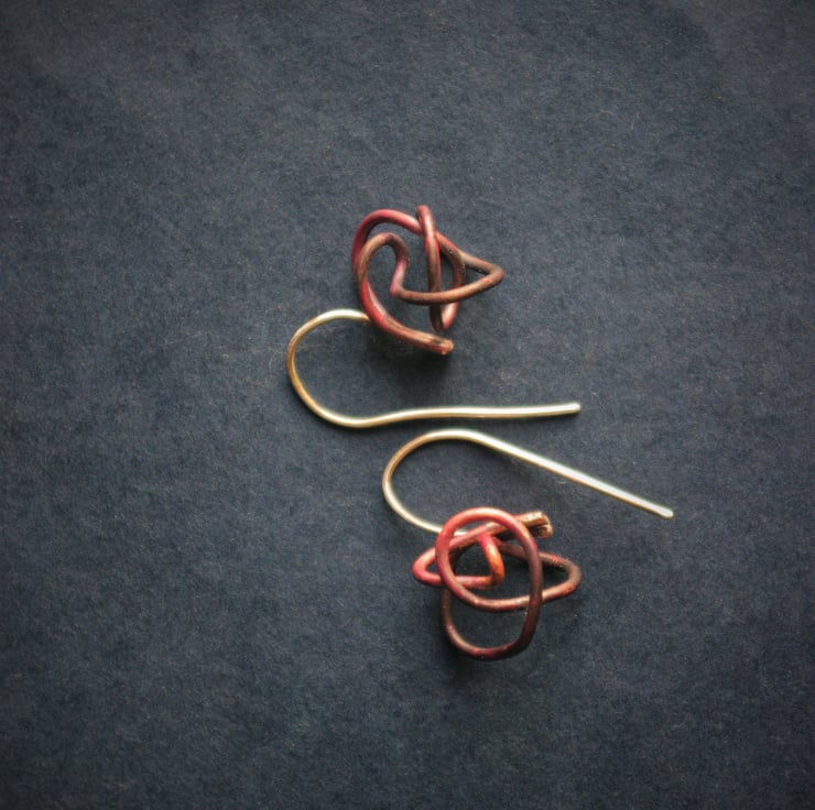 The earring is designed to drop just off the earlobe , so it hangs down 20mm/ three quarters of an inch from where it goes into the ear. The copper squiggle is about 10mm in diameter and has taken on deeper shades of copper through heating techniques.
