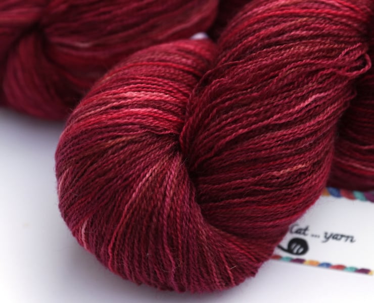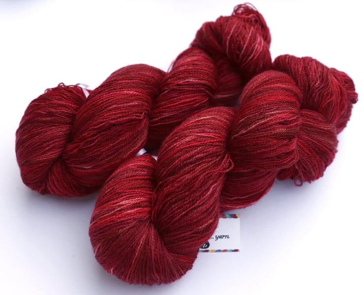 Shades of red, burgundy, maroon and hints of brown and pink. This lustrous, lofty, soft yarn should make beautiful lace projects, and these skeins are the superwash version of my regular Bluefaced Leicester laceweight yarn. There is one skein left. Photographs have been taken and edited in bright natural light - first photo is more accurate for colour.