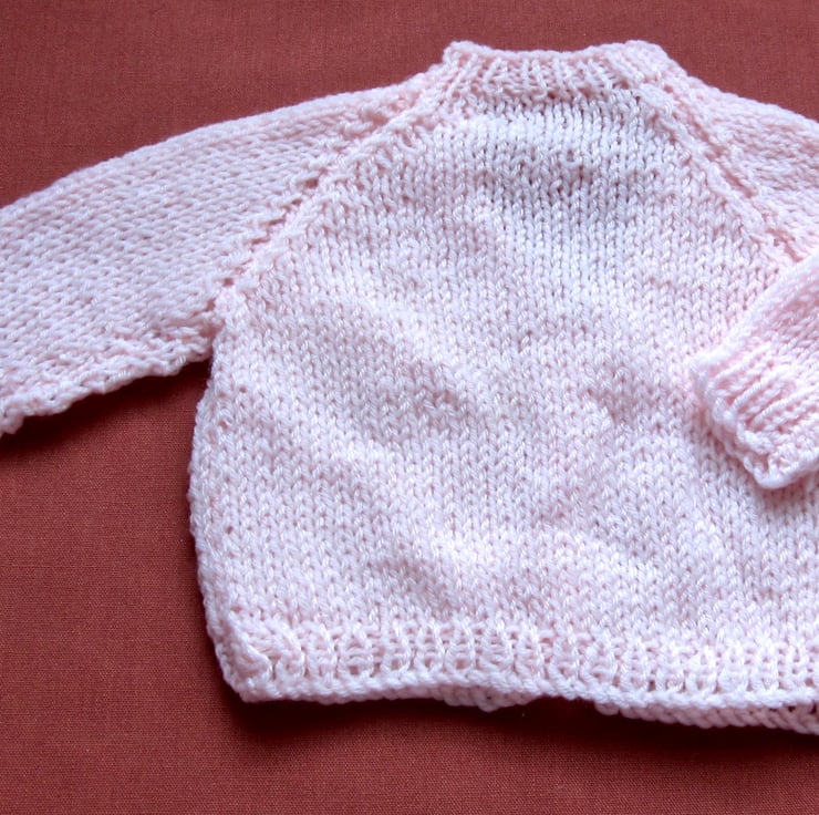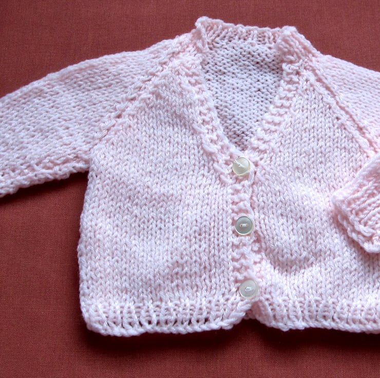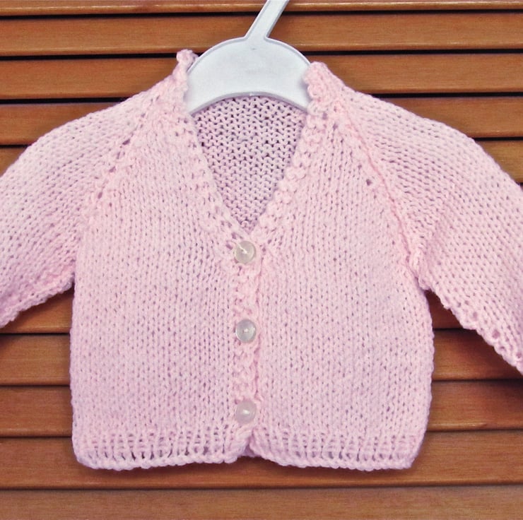 This basic, but pretty, hand knitted, baby pink matinee cardigant with the stand-up collar, would be perfect for a newborn baby (or a 'baby-sized' doll).