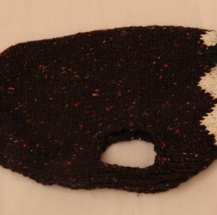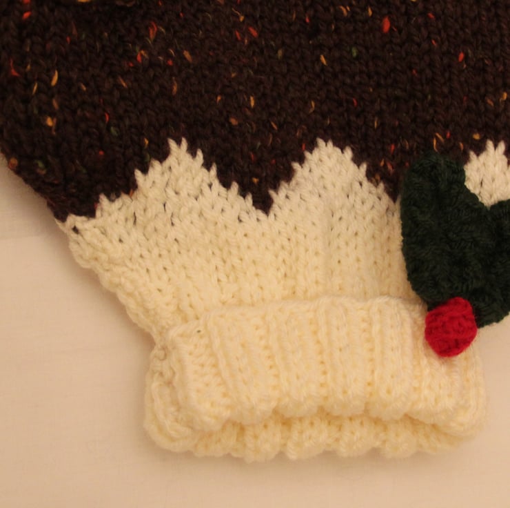 A lovely cosy (and a wee bit silly) Christmas Pudding jumper, with holly & berry garnish. knitted to my own design, especially for a slim dog.