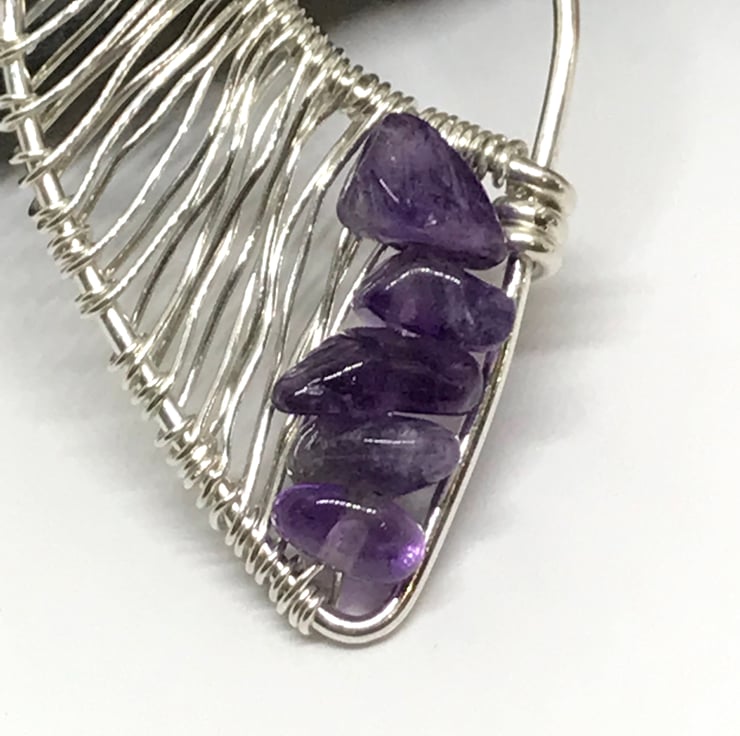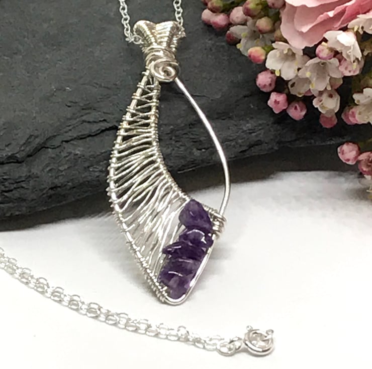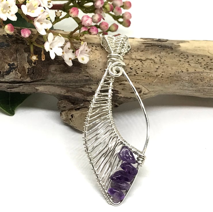 I have formed sterling silver wire into an leaf shape including a bail which is finished with a swirl. The bail has a wireweave pattern made with fine sterling silver wire which is continued along the pendant. At the tip of the pendant I have added beautiful Amethyst chip beads. The pendant is completed with a sterling silver 18” chain.