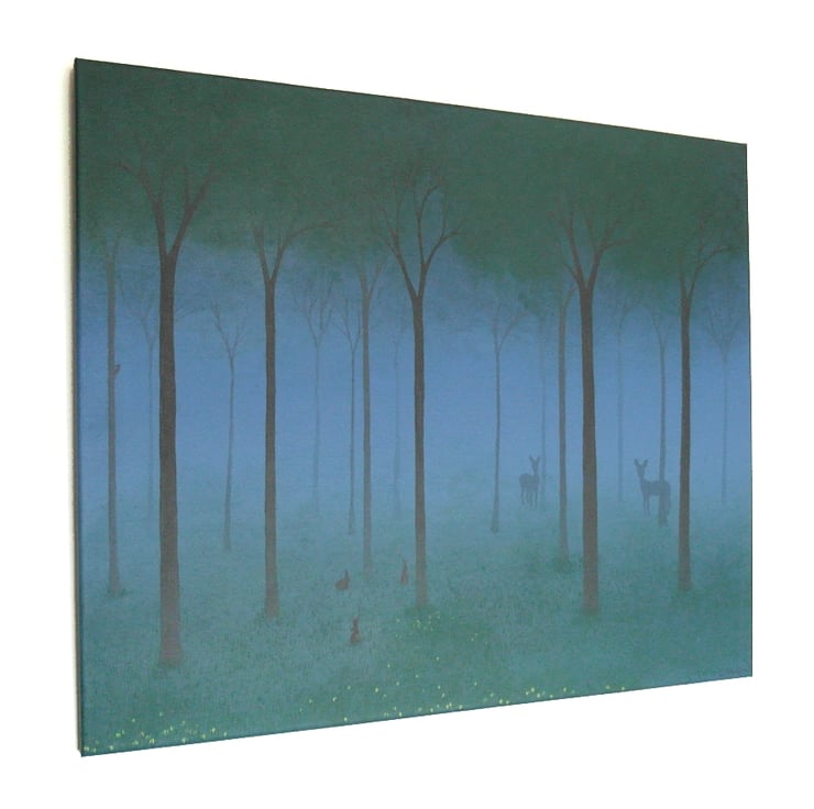 A woodland scene of a misty summer morning, with 3 little rabbits nibbling on the grass beneath the trees, and the hazy silhouettes of 2 deer further in the distance.