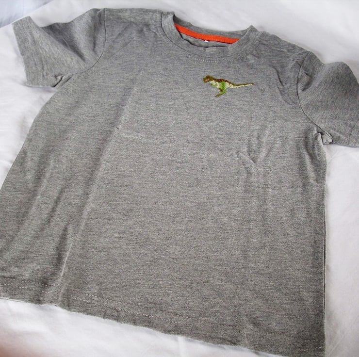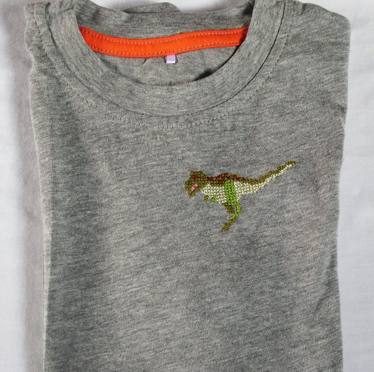 Almost all kids love dinosaurs, especially the scary, ferocious T-rex. I have hand embroidered a green T-rex, pink mouth open, as he runs across the front of this grey-marl T-shirt. The shirt is cotton viscose and is machine washable.