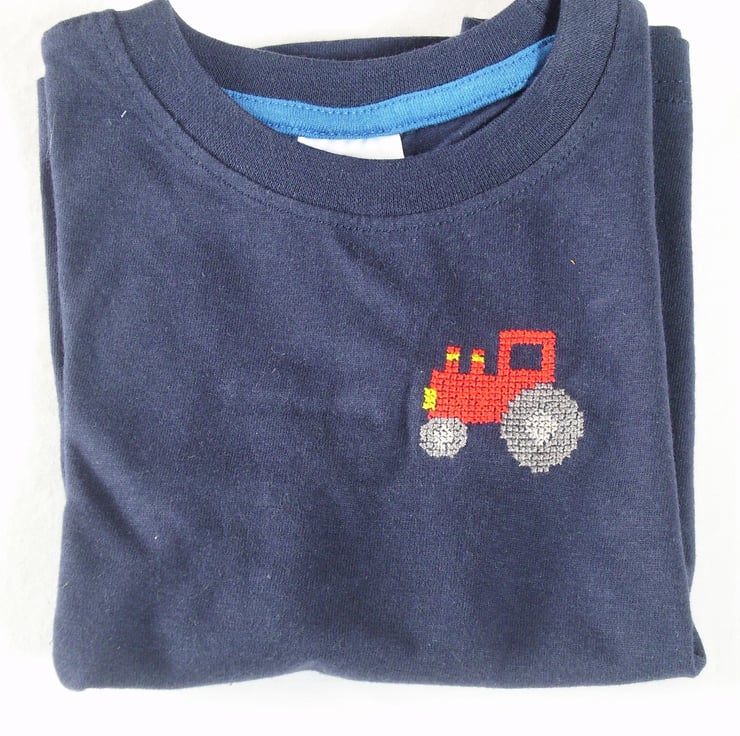 This dark navy shirt has a red tractor hand embroidered on the front. It is 100% cotton and is machine washable.