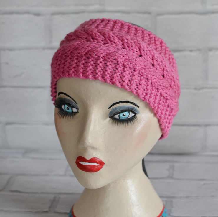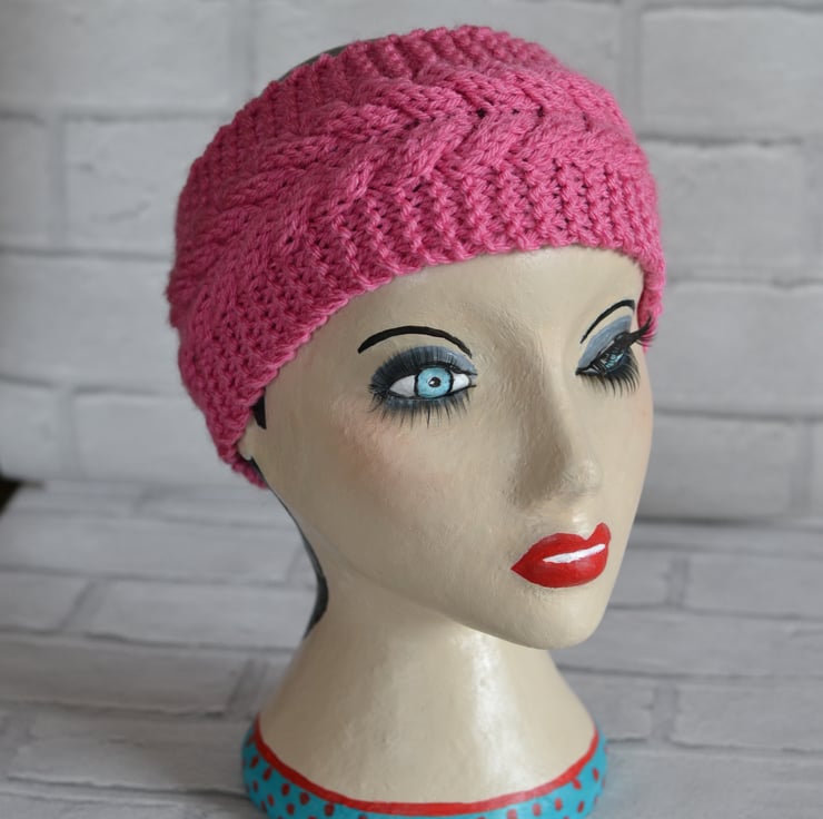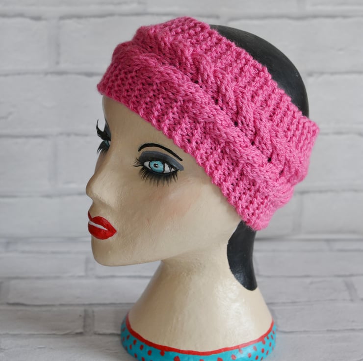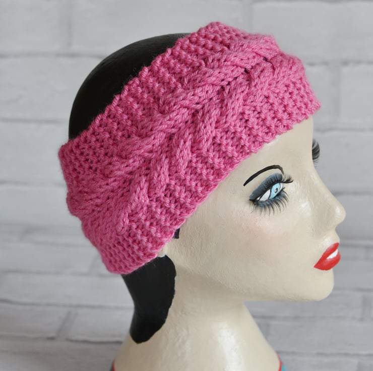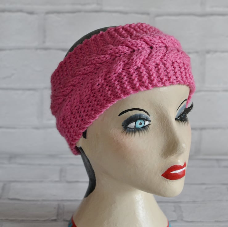 Cable chunky knitted wide headband earwarmer. Knitted in a lovely pink shade. It will fit heads 22" - 23". Keeps your ears lovely and warm.