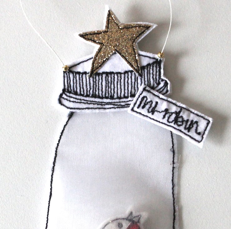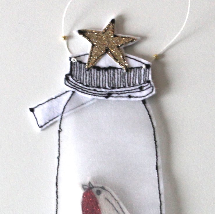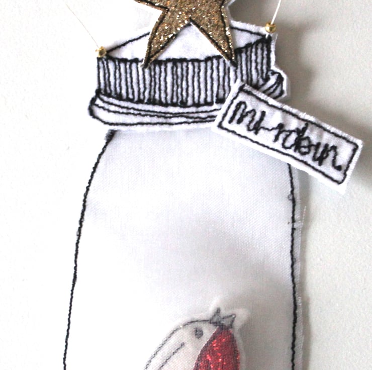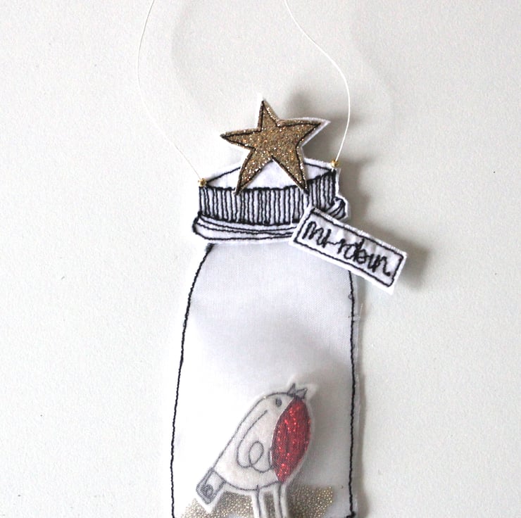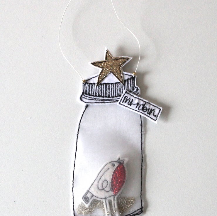 A little jar created using silk organza, holds Mr Robin with golden glitter.