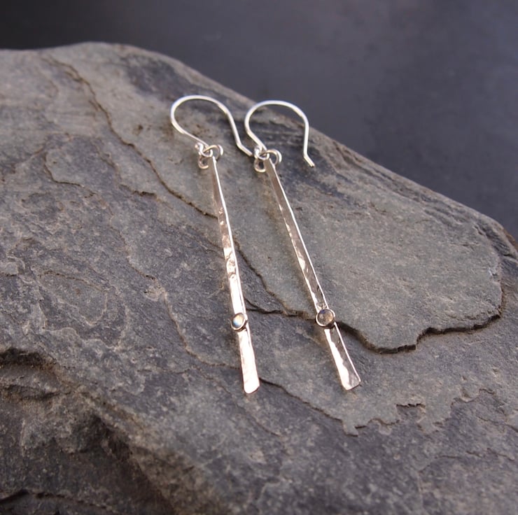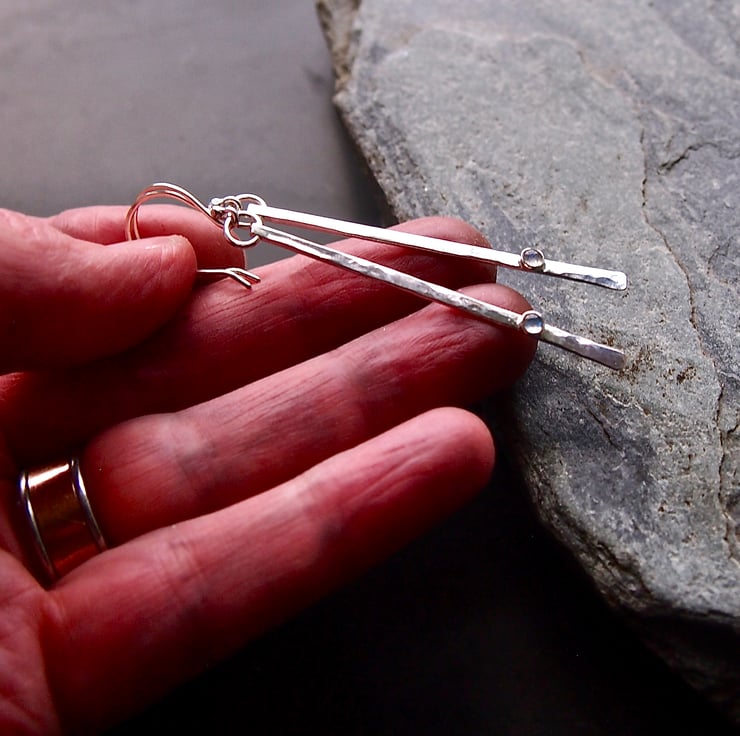 These earrings follow on from the long organic stick earrings. They are forged from sterling silver with a taper at the top that slides into a ring to hang them from hand made ear wires.