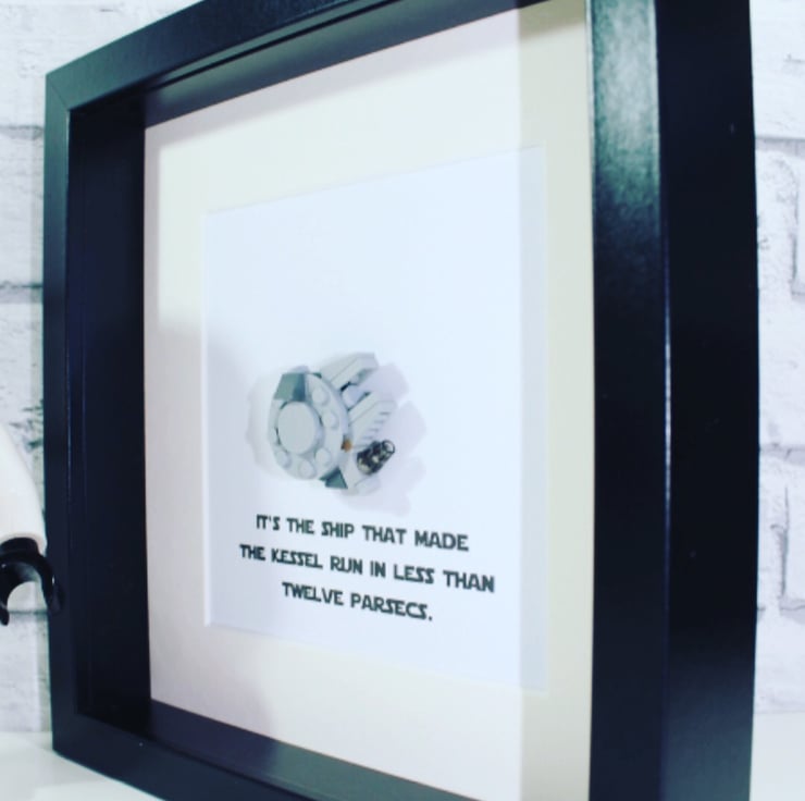 This deep box frame features a Lego mini build of the Millennium Falcon. This ship has been mounted along with the famous quote associated with it. This is a must for any Star Wars fan!