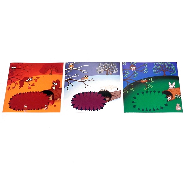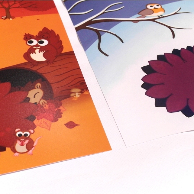 A set of 3 prints, featuring the same landscape over different times of the year, with cute British wildlife in autumn, winter and spring.