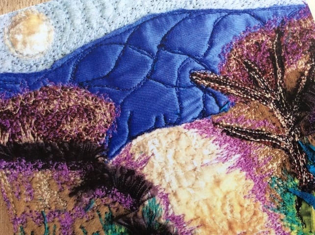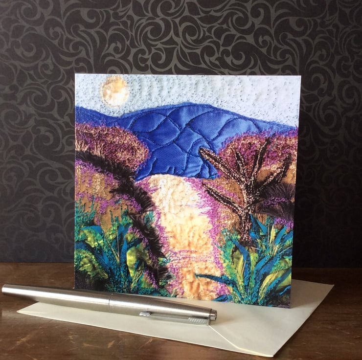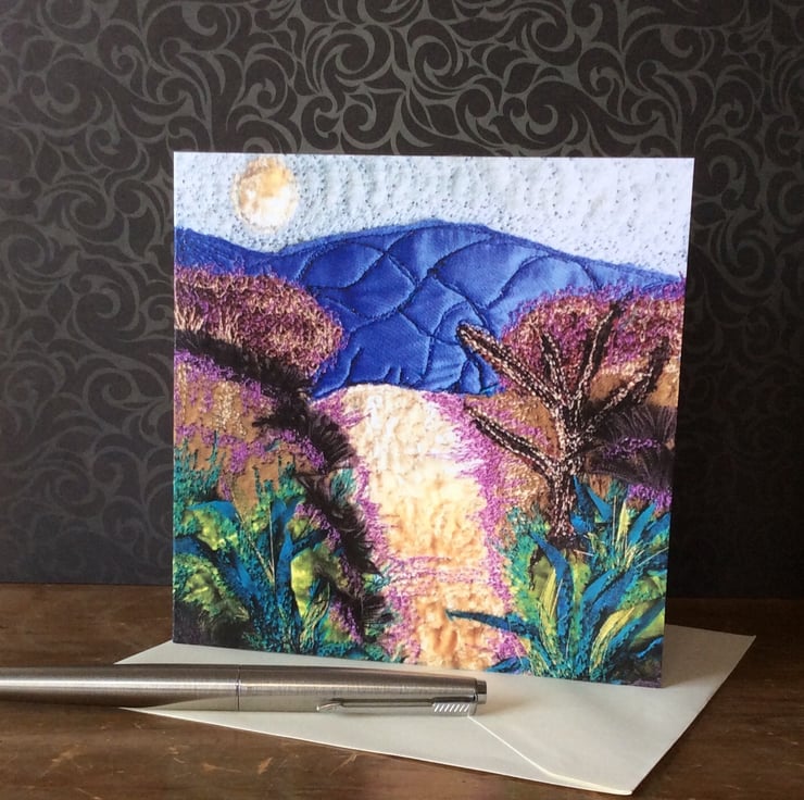 This card is a print of one of my free motion embroiderd landscapes of Yorkshire. It shows a path making it’s way through plants on either side to the hills in the distance. The card measures 14.5 x 14.5cm and it comes with a cream envelop in a plastic cover for protection.