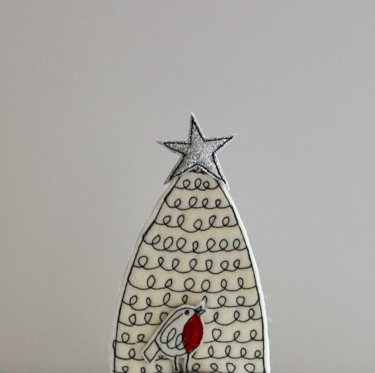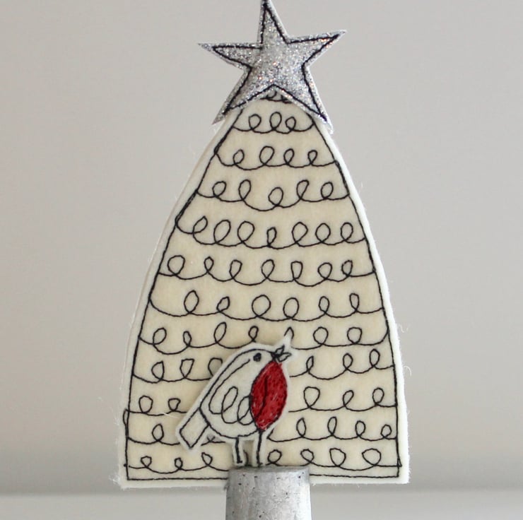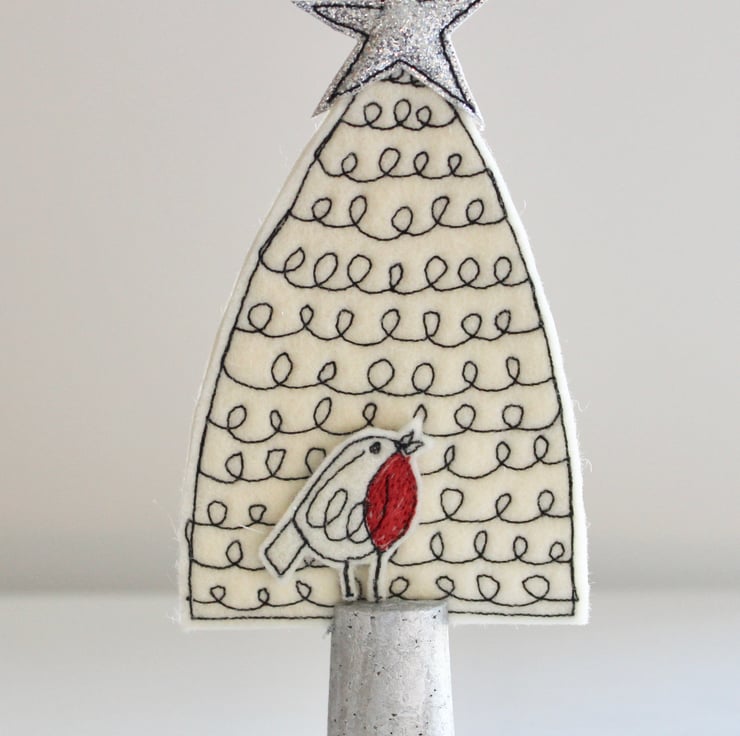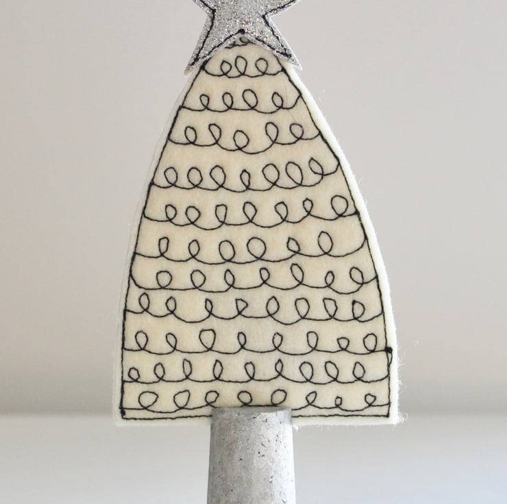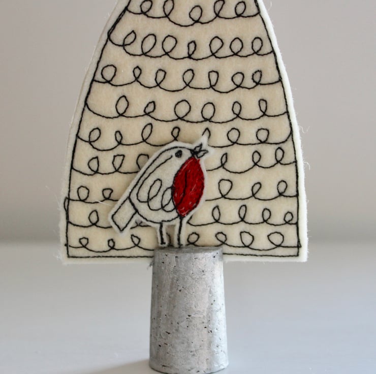 Little trees are created using free hand machine embroidery, 100% wool felt, glitter cloth and hand painted cork trunks.