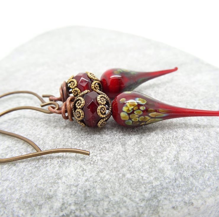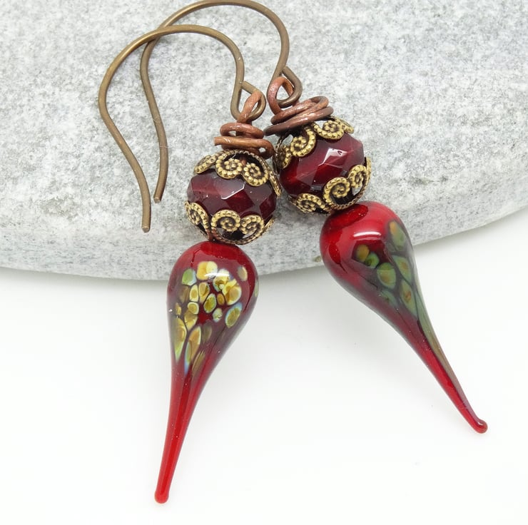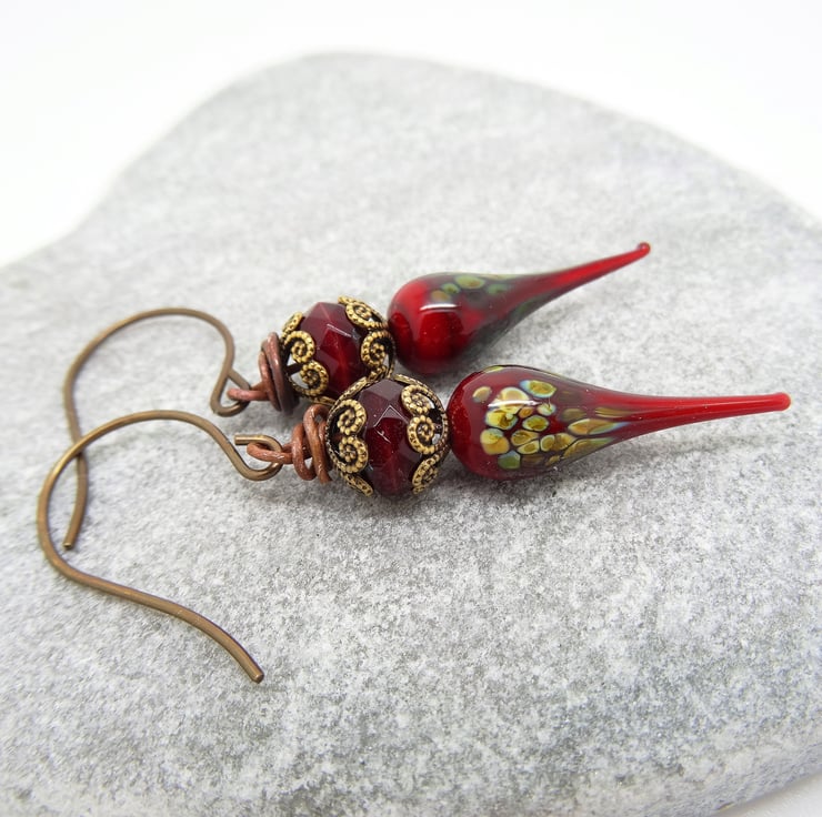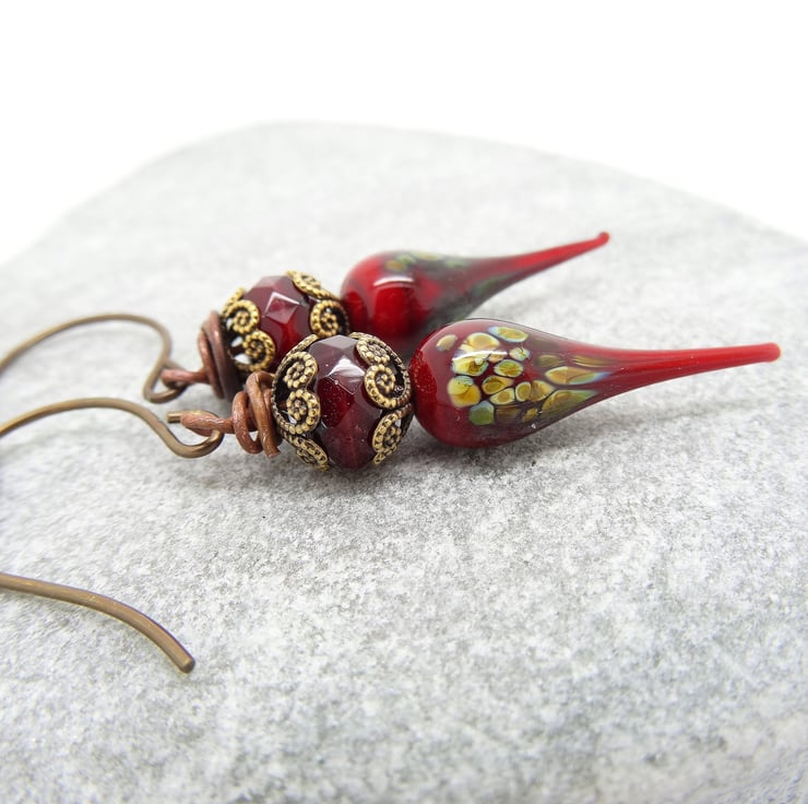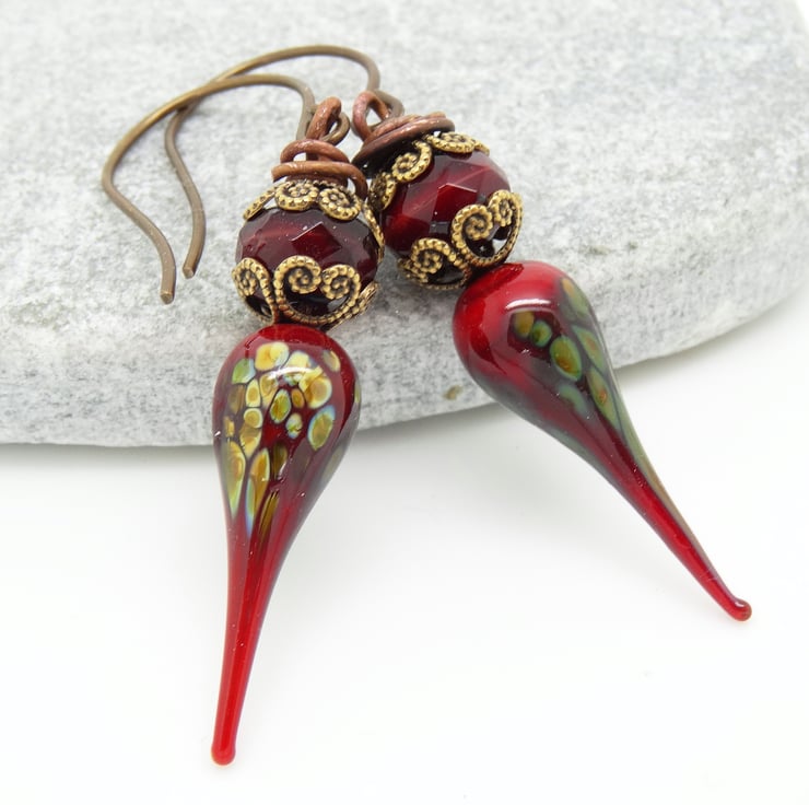These earrings are just gorgeous. I have made them using handmade lampwork glass spikey dropper beads by US artisan Elasia, the colour is the deepest ruby red with a pattern in muted shades of blue and mustard. To these I have wired 9 x 6mm czech glass faceted rondelles also in deep red and topped and tailed with beautiful filigree bead caps. The earrings measure 2.25 inches (just under 6cm) from top of vintaj brass,nickel free,round loop earwires.