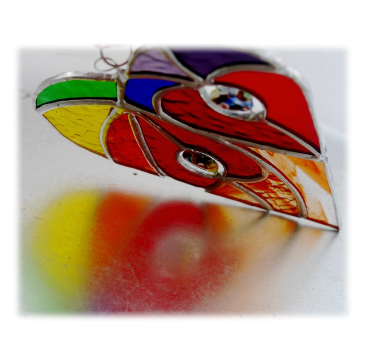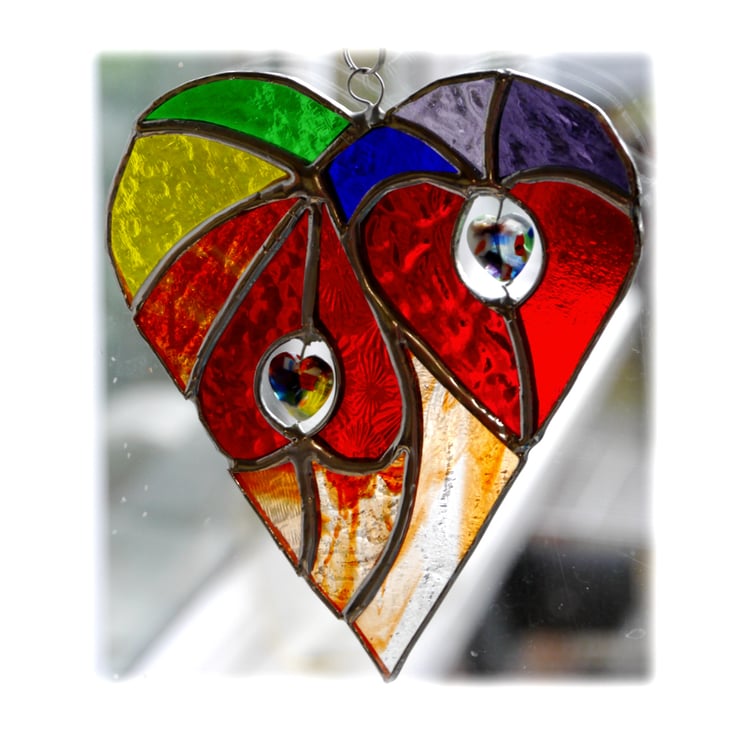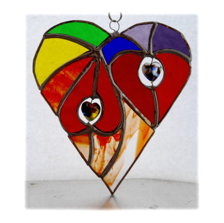It is a big heart containing 2 smaller, bright red hearts which are surrounded by different shades of glass in all the colours of the rainbow.