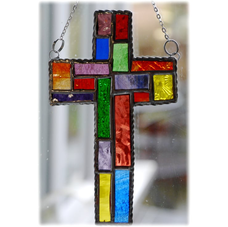 Cross Suncatcher Stained Glass Patchwork Rainbow Handmade 028