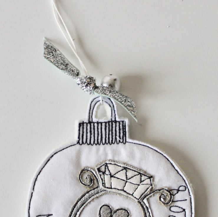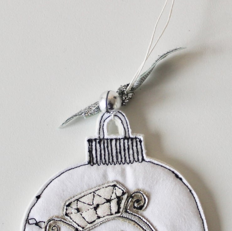 Wool felt bauble is created using 100% cream wool felt, glitter cloth, glitter ribbon, a bell and free hand machine embroidery.