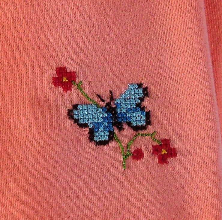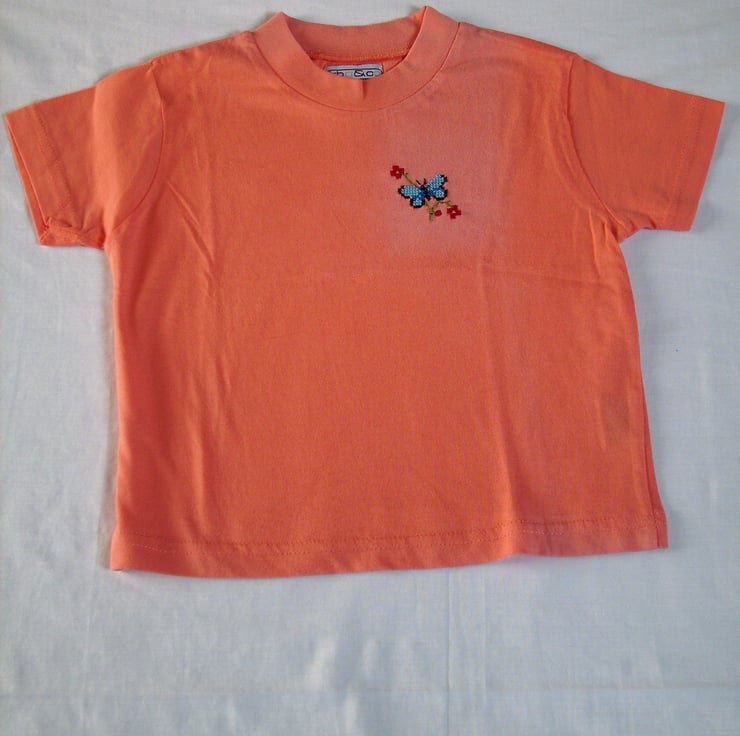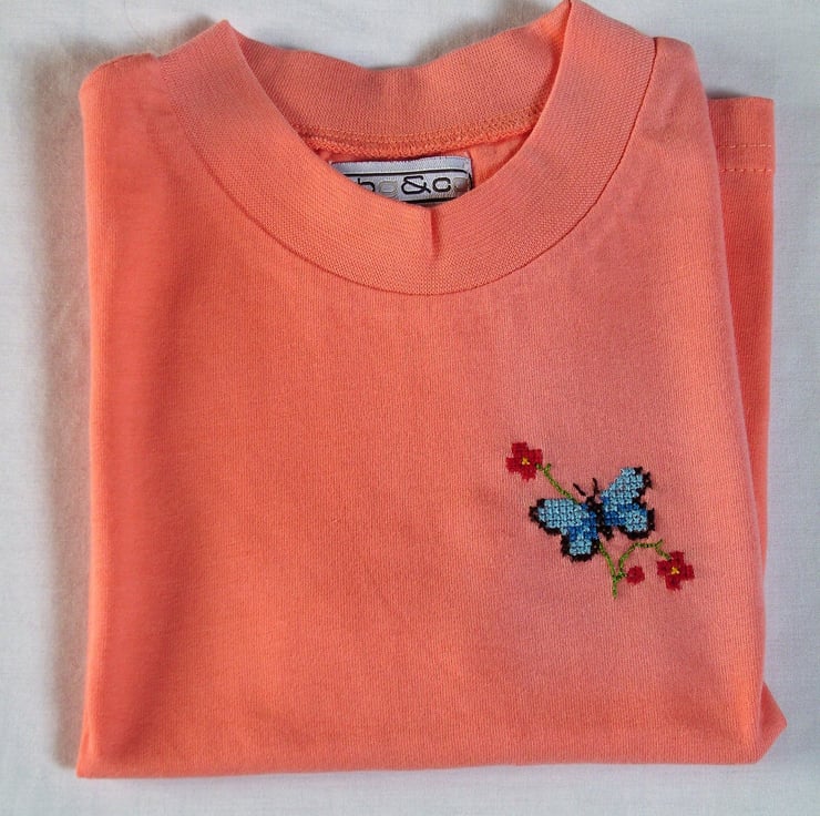I have hand stitched a blue butterfly visiting a sprig of scarlet flowers on this pretty peach T-shirt. The shirt is 100% cotton and is machine washable.