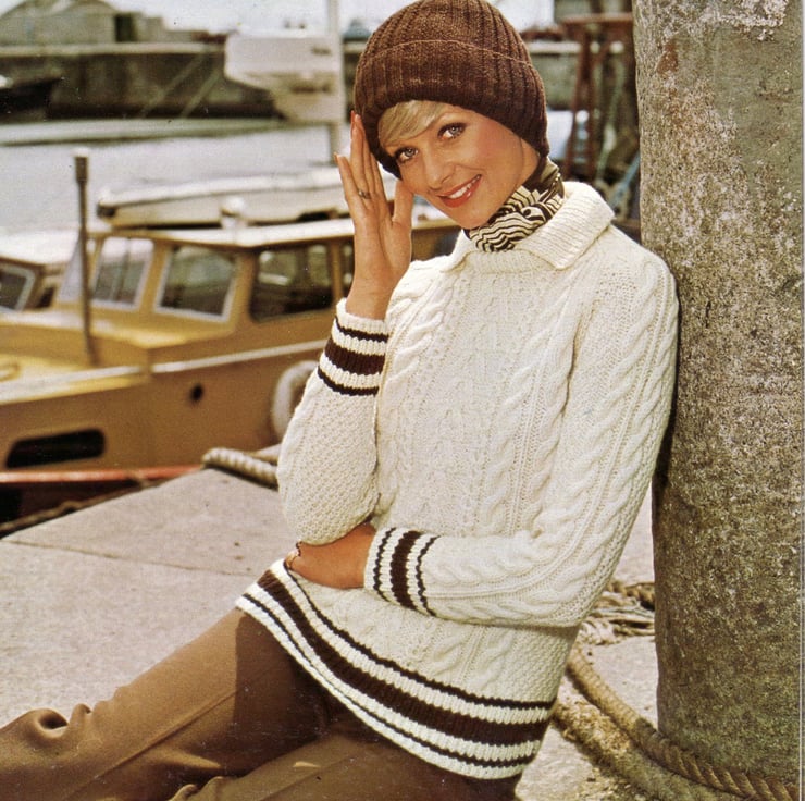 Here is the pattern for this Nautical style sweater. It is intensively cabled with a round neck and an optional small collar. Whether or not to include the contrast colour for the banding is up to you, but it does finish the design nicely, don’t you think? (Please Note: The hat is NOT included in the pattern.)