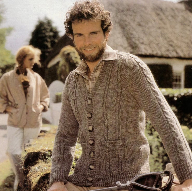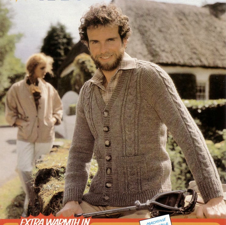 This is the pattern for a very fashionable Cardigan. It is intensively cabled, has a V neck, long sleeves and two front pockets.