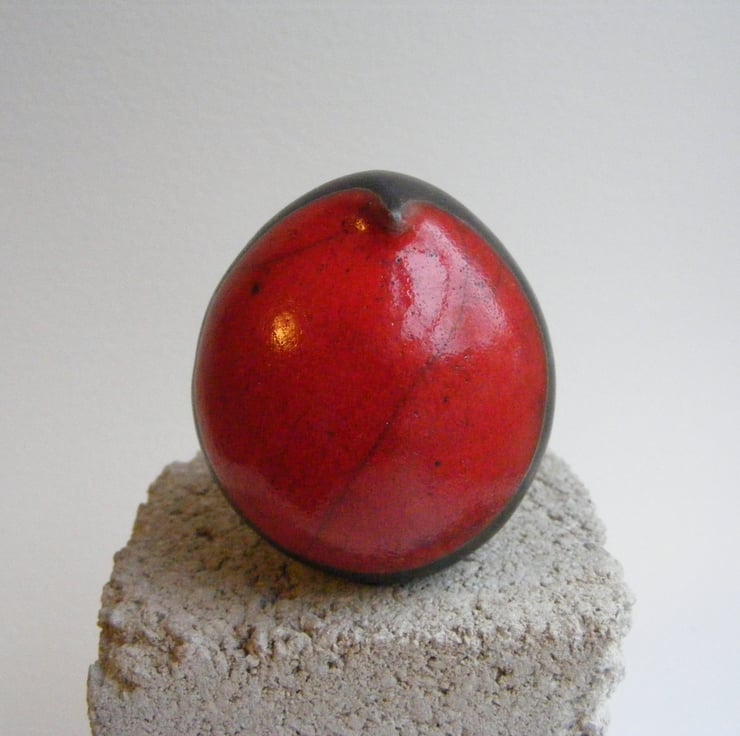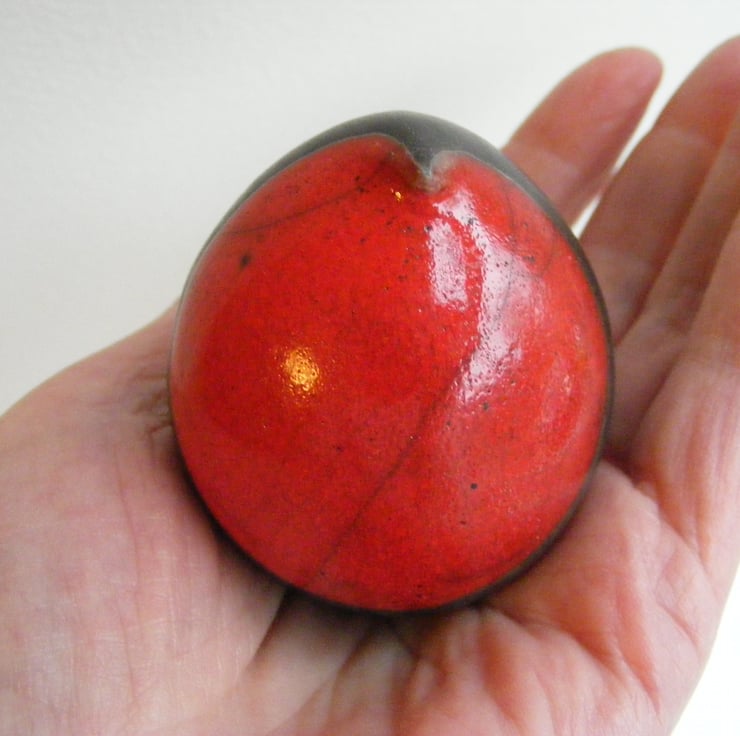 This robin is hand made and measures, 5cm high and 5.5cm long. It is made fom white earthenware clay and fired first in an electric kiln then the red glaze is painted on and it is raku fired in a gas kiln, the black part of the bird has been sanded and is unglazed and polished with beeswax.
