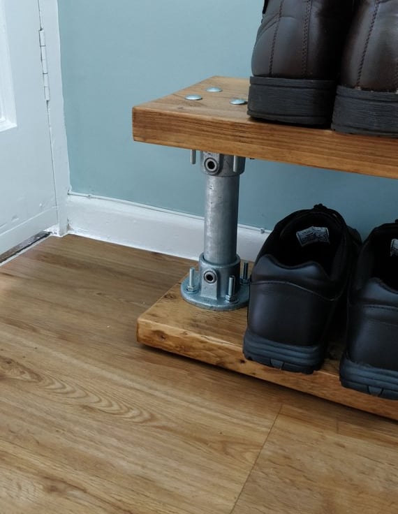 This beautiful unique shoe rack has been handmade using reclaimed scaffold planks and steel pole from Hoar Cross in Derbyshire, it has been stained in light oak which pulls out all of the natural details in the knots and wood grains, a protective layer of varnish has then been applied which gives it a nice silky shine.
