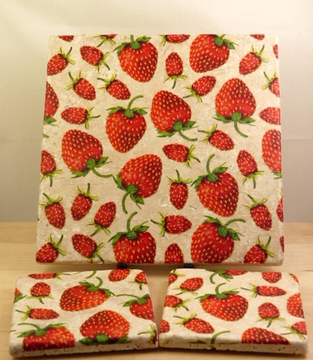 A 20cm square natural stone table mat and two matching coasters measuring 10cm x 10cm decoupaged with papers napkins of strawberries. All items have a cork base to protect your furniture and have been coated with matt lacquer so they can be wiped with a damp cloth (do not immerse in water). The tablemat would make an ideal centrepiece on your table, for your teapot or warm plates or just to display in your kitchen. An ideal gift for family and friends.