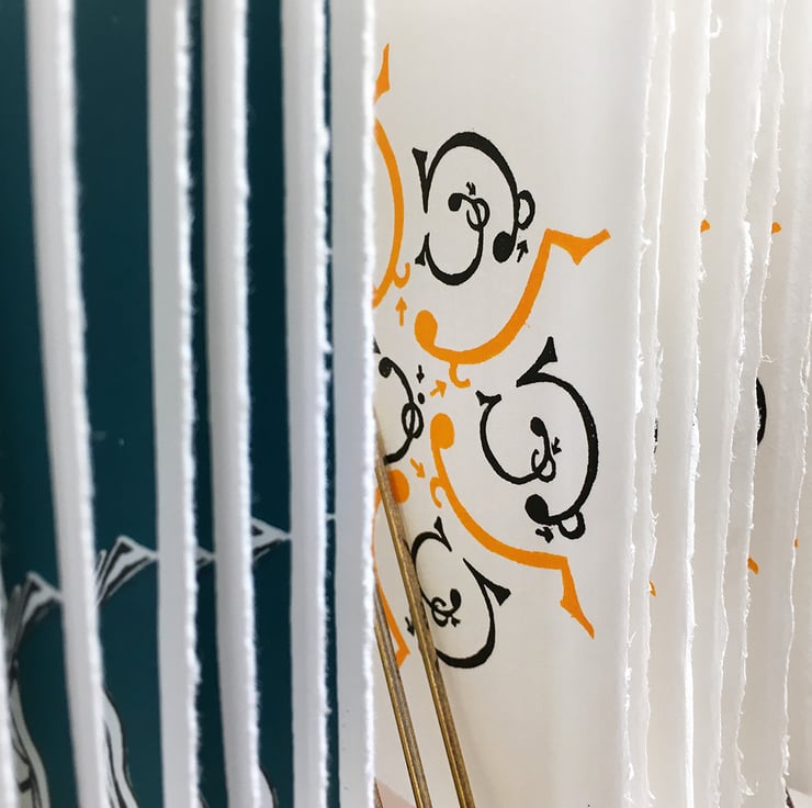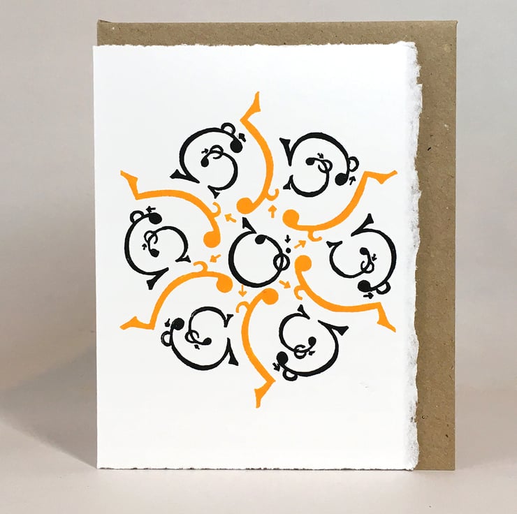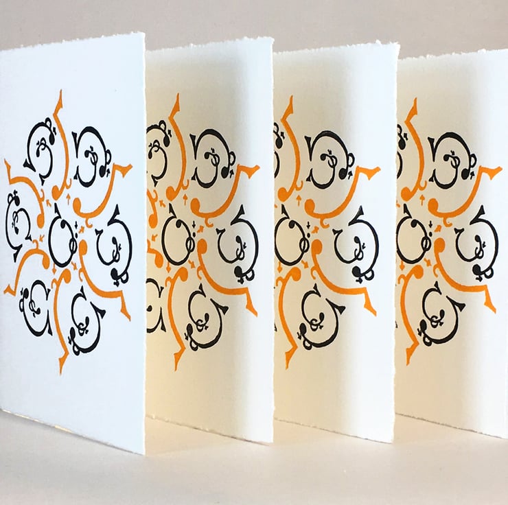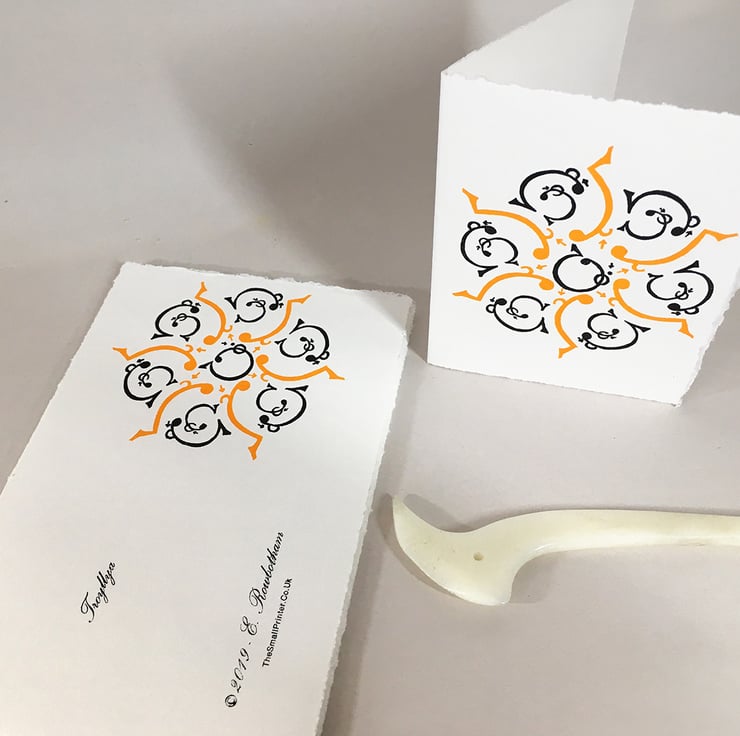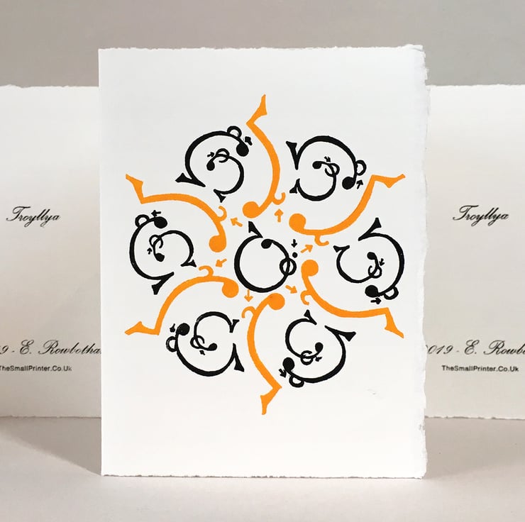 I’ve cut two Lino blocks to create the image, which I hand-inked & hand-printed using my old Adana Press. I inked one in a rich Golden Yellow & the other in soft Seville black. I then typeset info on the back hand-set in old letterpress, hand inked & printed on my ancient Press - which I then fold to form a card.