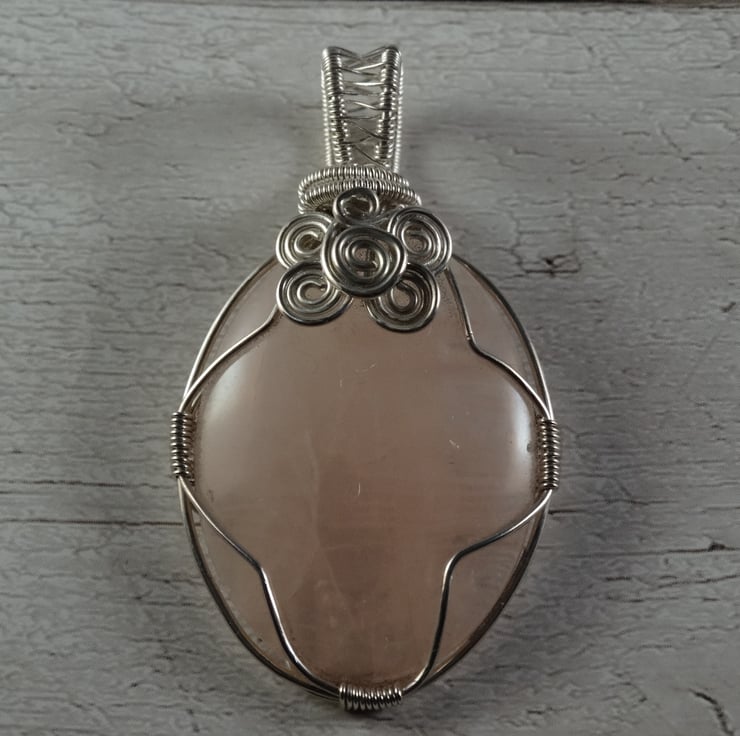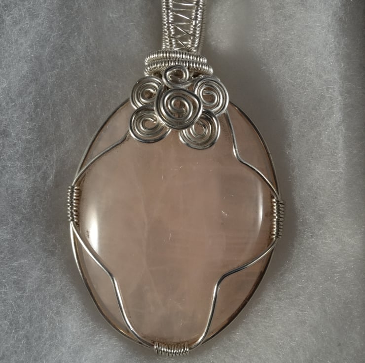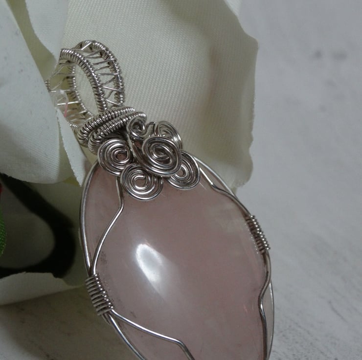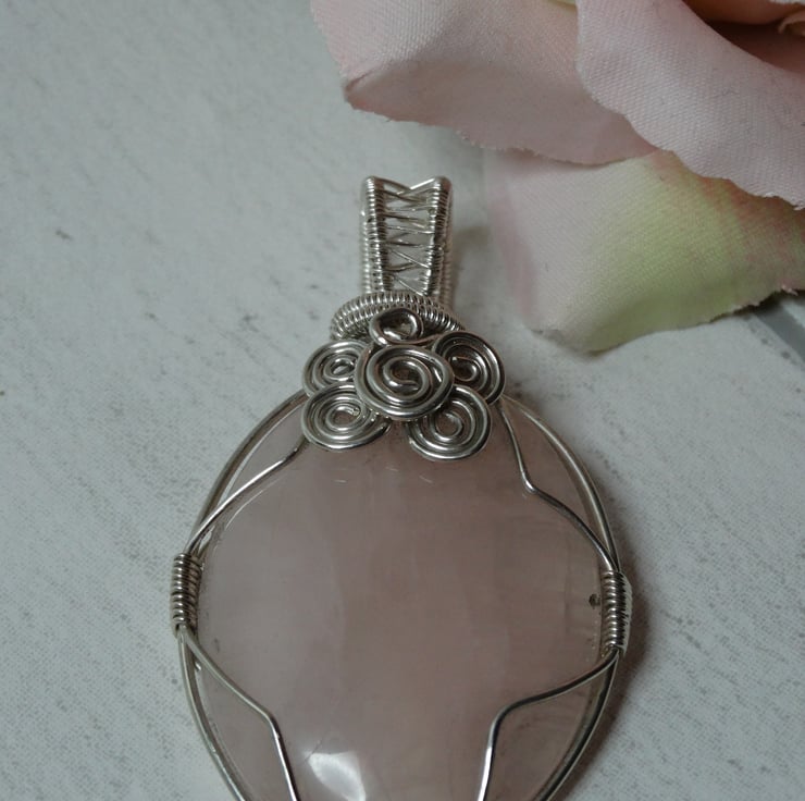 This is a lovely Rose quartz cabochon. Wire wrapped in sterling silver with a coil base bail, the design finishes with petal inspired swirls.