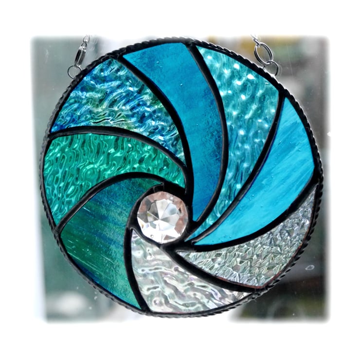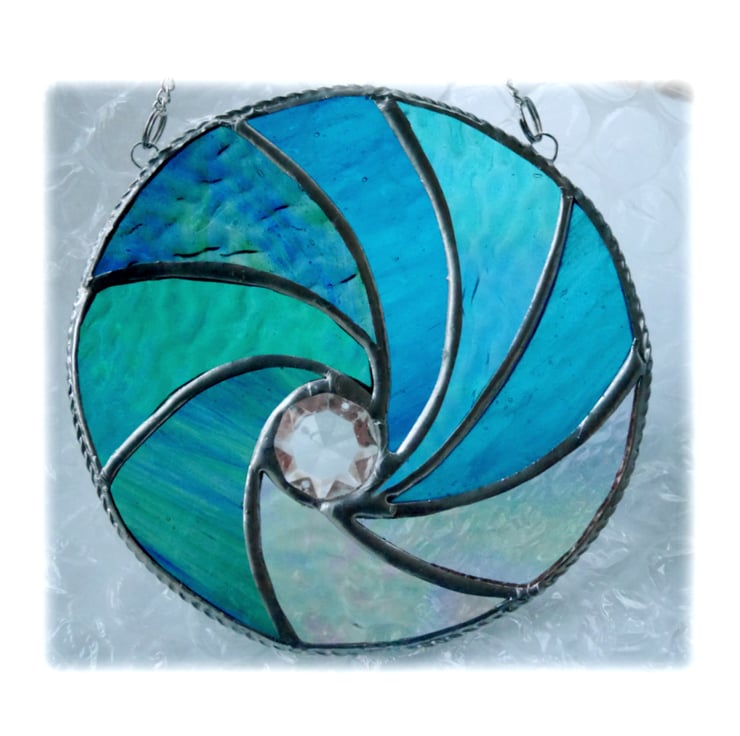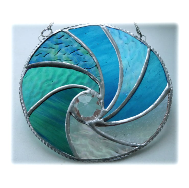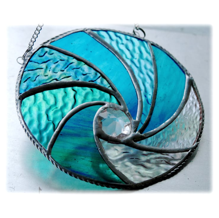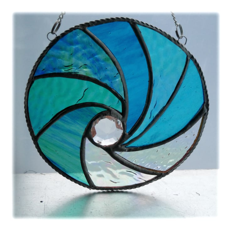 I've formed the waves into a circle and used lots of types of gorgeous aquamarine textured glass plus some clear iridescent glass for the effect of the froth of the waves. In the centre is a large multifaceted and very sparkly crystal..