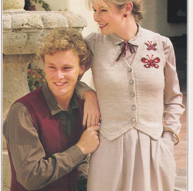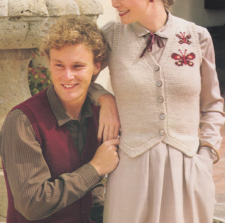 Here is a pattern for a unisex, knitted, buttoned waistcoat. It is quite plain in the majority of its construction, although it does have the option of the intarsia butterfly motif if you want to include it. I particularly like the 'V' shaped hem at the front, very smart.