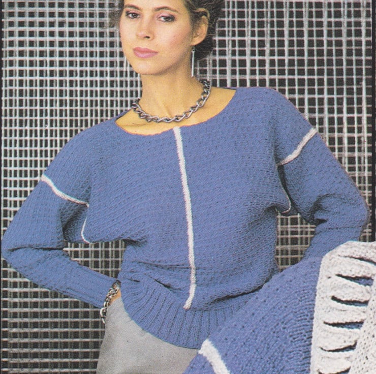 The Dolman Sleeved Sweater is beautifully, but simply, patterned. Accent rows, colour coordinated with the Slipover are sparingly used.