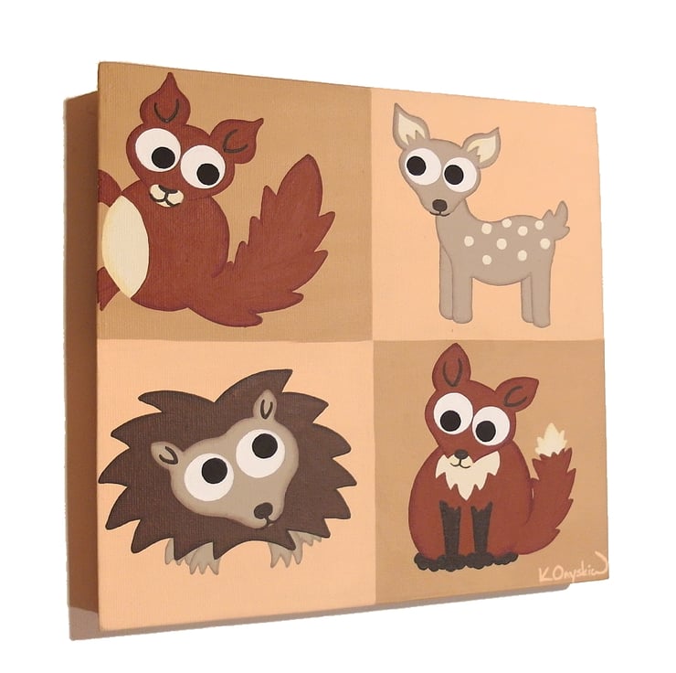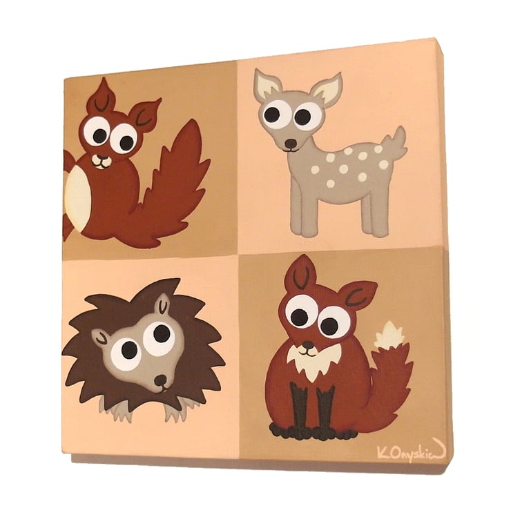 Cute woodland animals on peach and fawn brown squares. The cartoon nursery artwork features a red squirrel climbing the edge of the canvas, a fawn deer, a little hedgehog and a red fox.