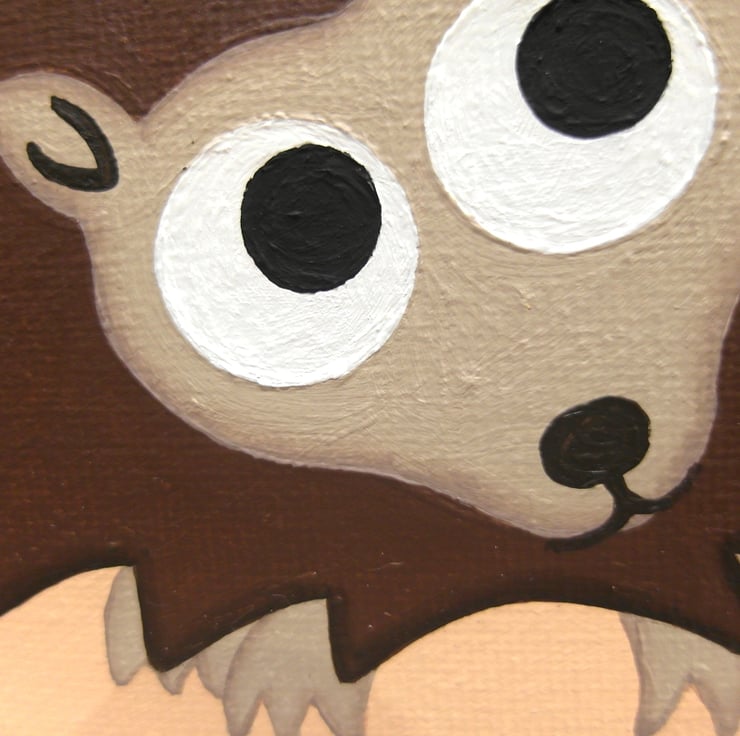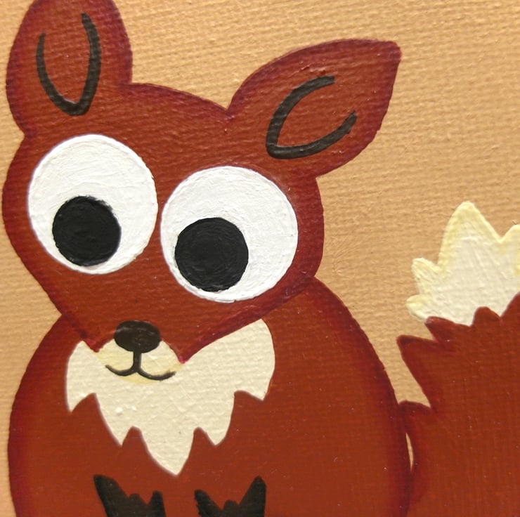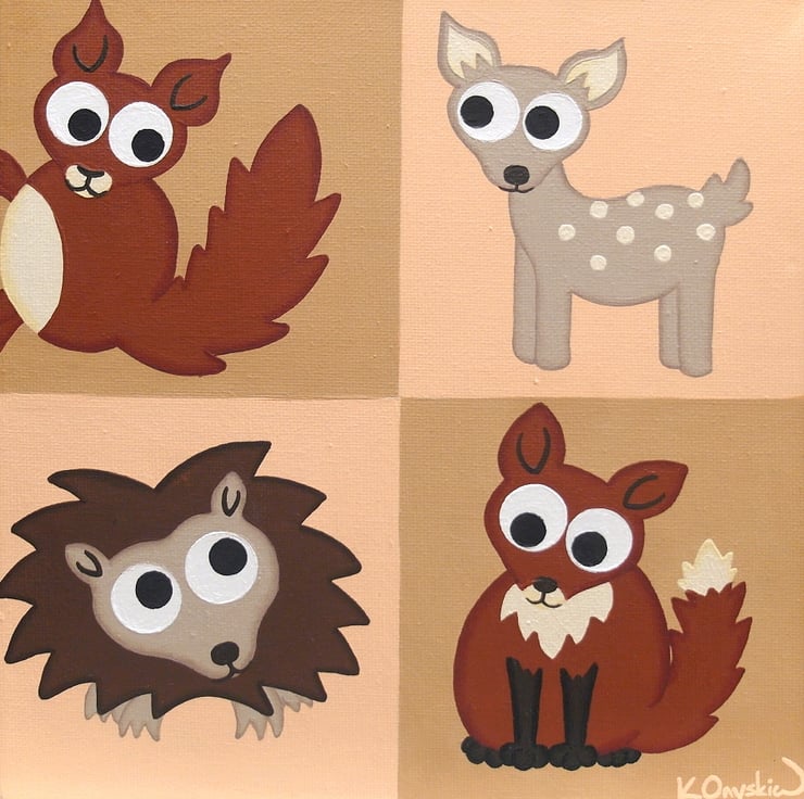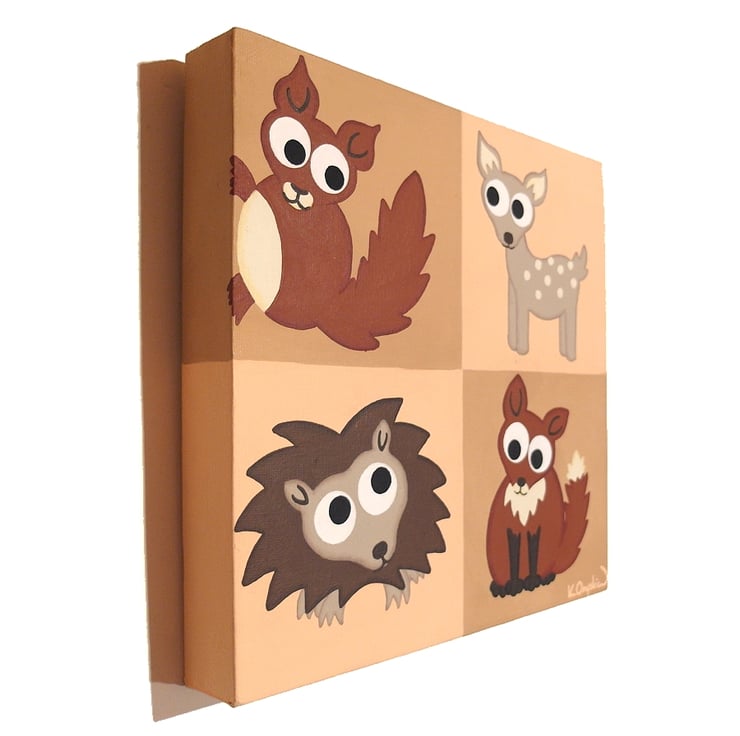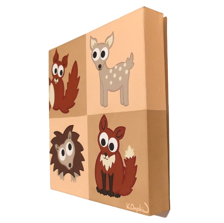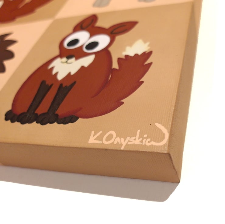 This original cute animal art is painted in acrylics on a 25cm x 25cm and 3.5cm deep canvas (9.8" x 9.8" and 1.4" deep). The squares carry on over the edges of the canvas so there is no need for framing, and a string is attached to the back so it is ready to hang.