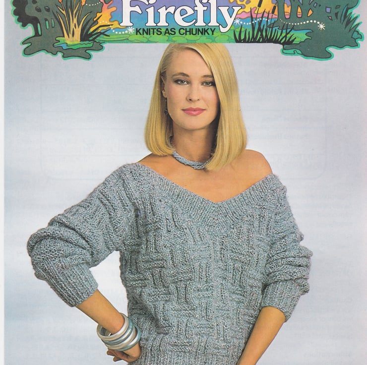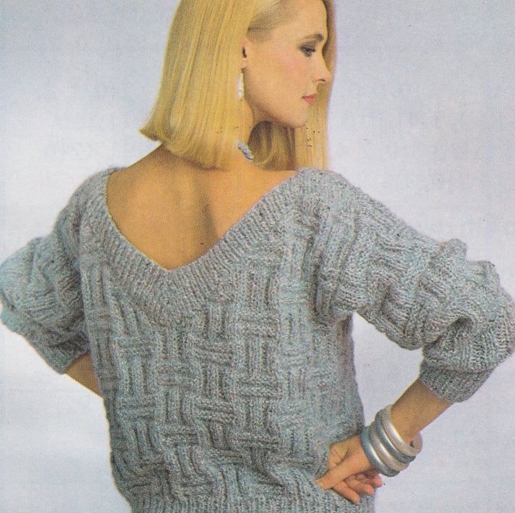 This jumper has a deep, plunging 'V' neck at both the front and the back. It is perfect for the 'off the shoulder' look, as shown on the pattern photo. The boxy pattern to this sweater is unusual. It’s made up of two horizontal blocks interspaced with three vertical blocks – like a knitted version of mad jenga!