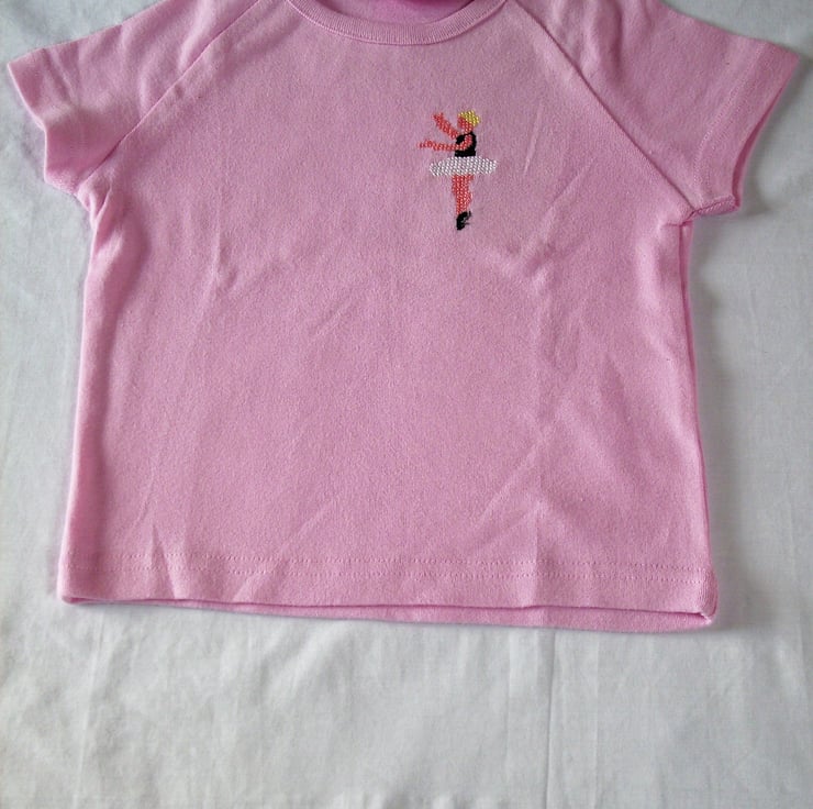 Is there a little dancer in your family? This is a pretty pink T-shirt with raglan sleeves. I have hand stitched a blond ballerina in a black leotard and white tutu on the front. As I never use a permanent backing material when hand embroidering kid's clothing, there is nothing inside to irritate your child's skin. The shirt is 100% cotton and machine washable, The label says 'age 3-4', but this shirt is the size of my other T-shirts intended for much younger children, so I have listed it as age 18-24 months.