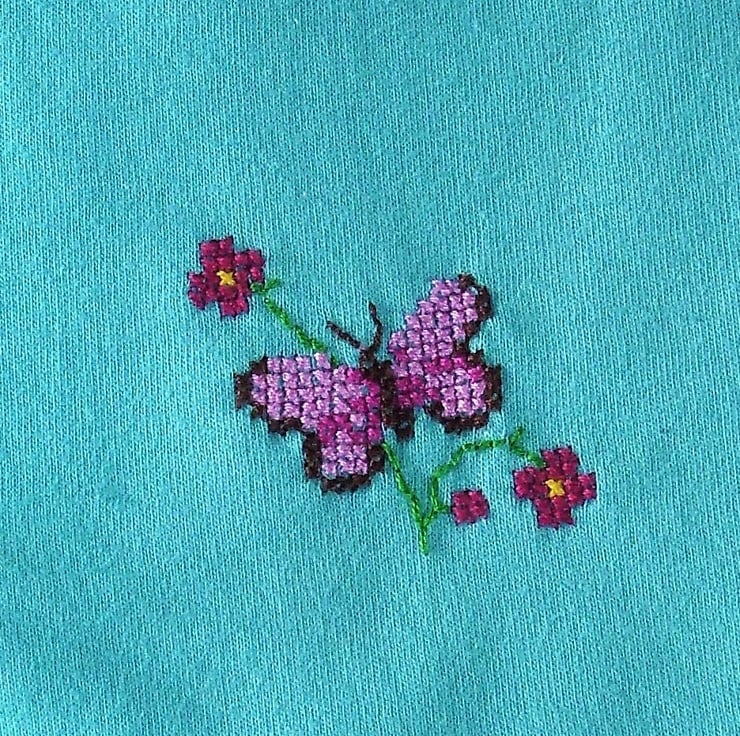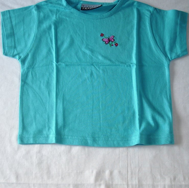 This is a pretty turquoise short-sleeved T-shirt, of a slightly shorter than average design. I have hand embroidered a pink butterfly visiting a sprig of magenta flowers on the left front. As I never use a permanent backing material when hand embroidering kids' clothing, there is nothing inside to irritate your child's skin. The shirt is 100% cotton and can be machine washed.