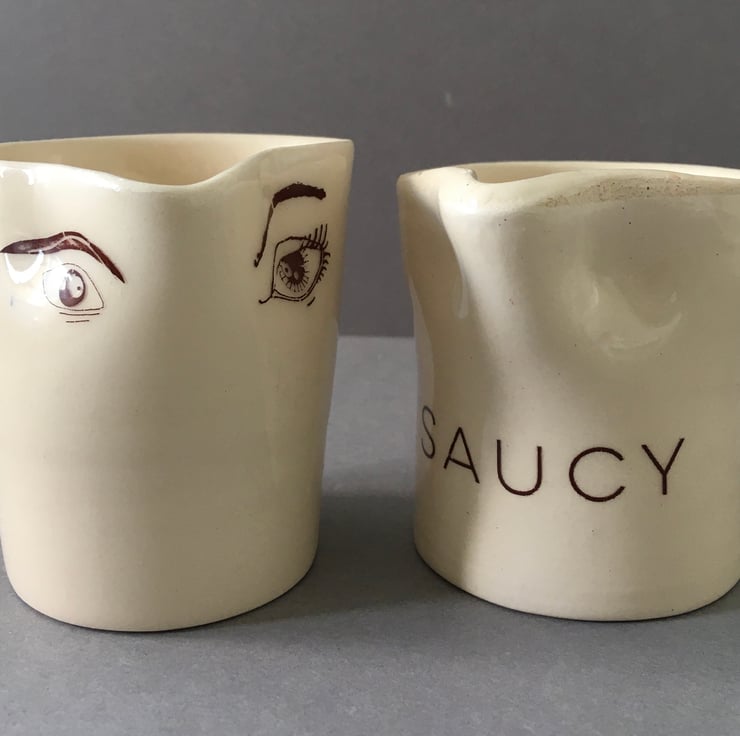 Off white, hand thrown earthenware pourer. Great for any hot or cold sauces. This one needed a set of eyes as it’s pourer was so very ‘‘Nose’ like. The eye decals are fired to a warm brown colour. A cheeky little gift or addition on any table that needs a chuckle!