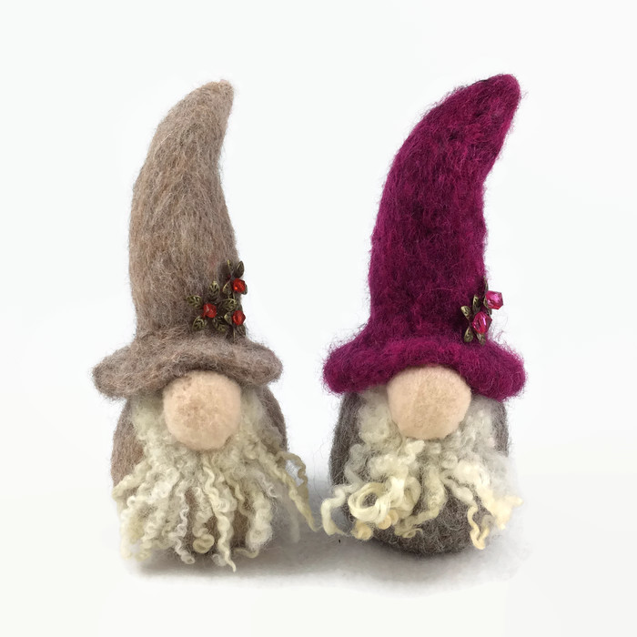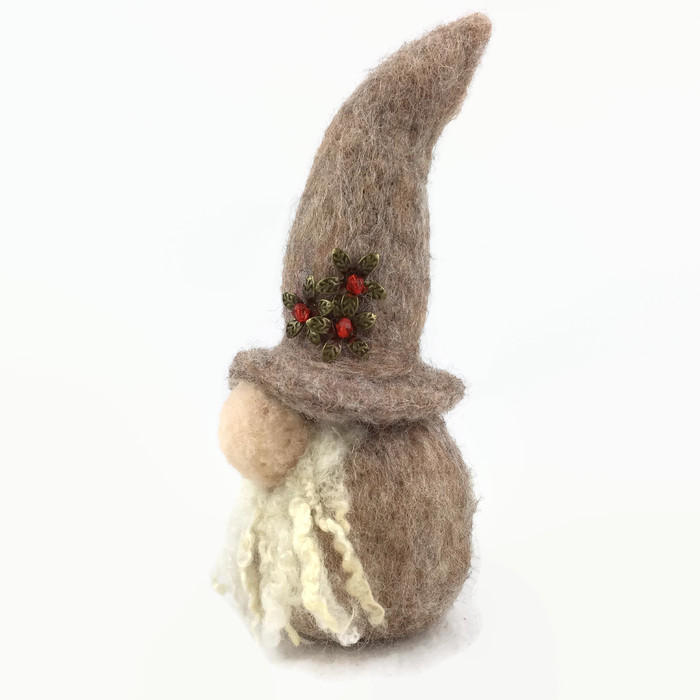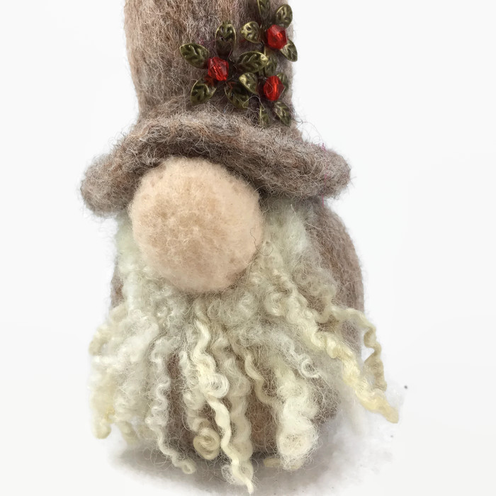 Needle felted using beige woollen fibres over a core wool base, this swedish style tomte has been sculpted into shape using a barbed felting needle. He has a bulbous flesh coloured nose and a white curly beard. Three flowers made using antique brass effect petals with red beaded centres adorn his hat.