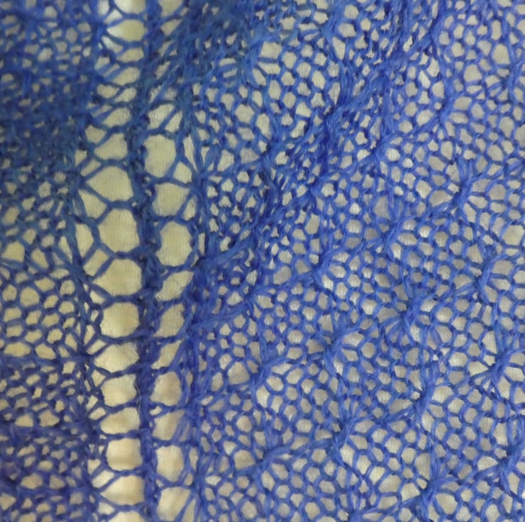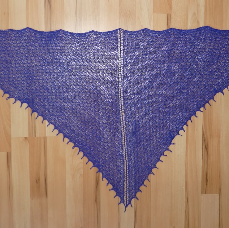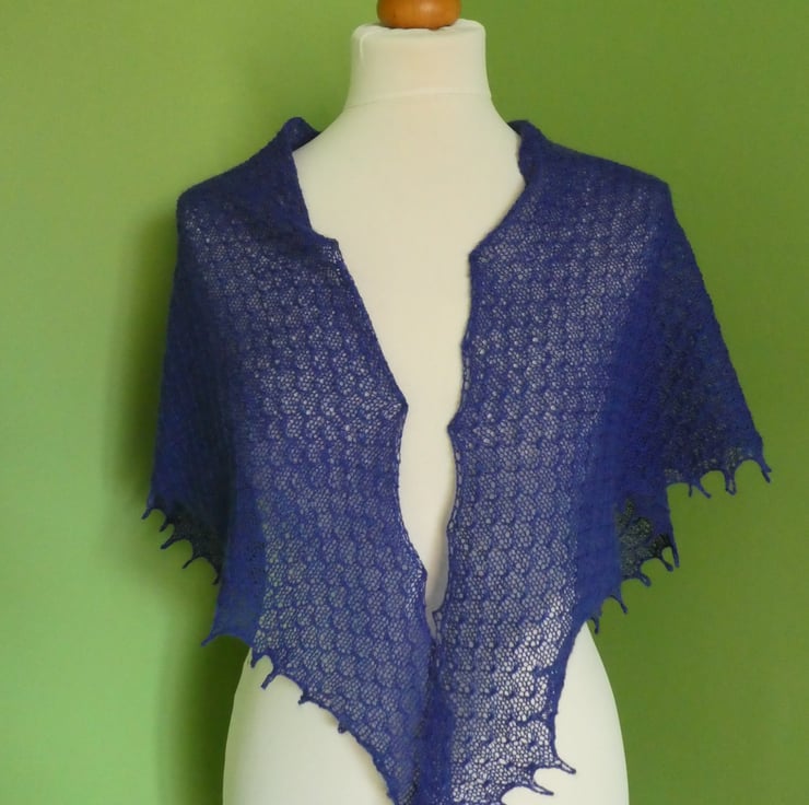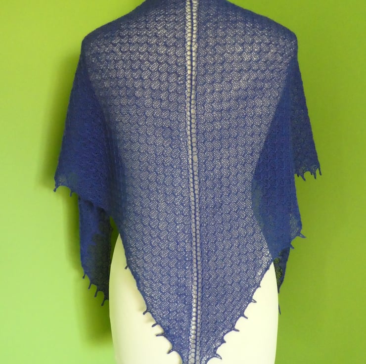 I have designed and created this beautiful tuck lace pattern shawl in a 2 ply pure new wool. It has been machine knit with an all over punch card lace pattern, to give a light scarf with a lovely drape. The shawl has been hand finished with a crochet edge. The shawl has been washed and blocked and is ready to wear. It measures 60" point to point, and is 27" deep at the widest part of the triangle.