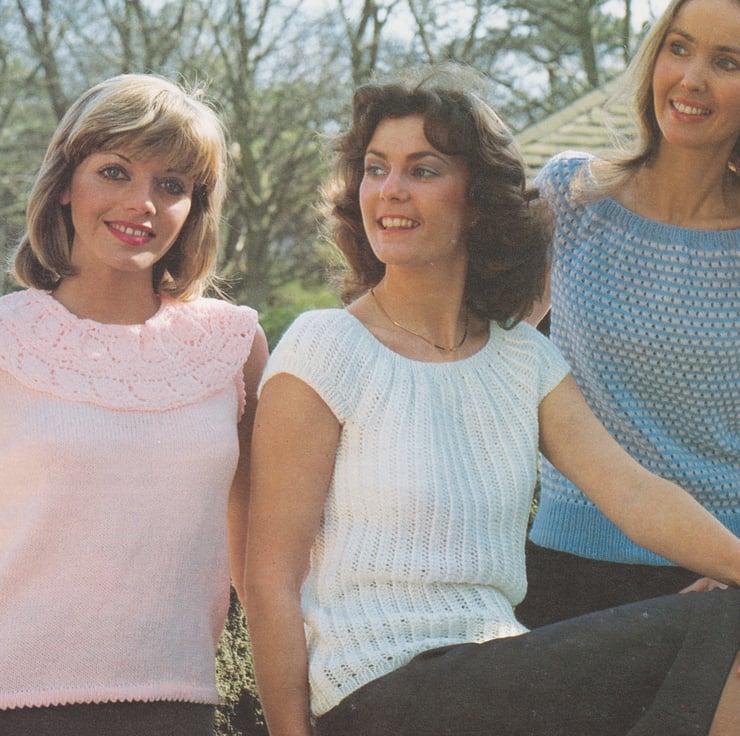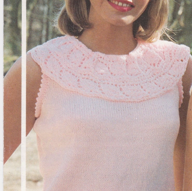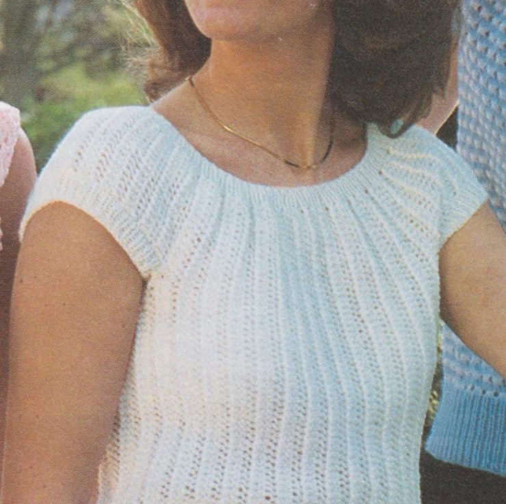 This one is very different. It has a wide, lacy ribbed design running from the neck down to the hem. Small cap sleeves are cleverly made at the same time as knitting the upper part of the top - they are not separate features.