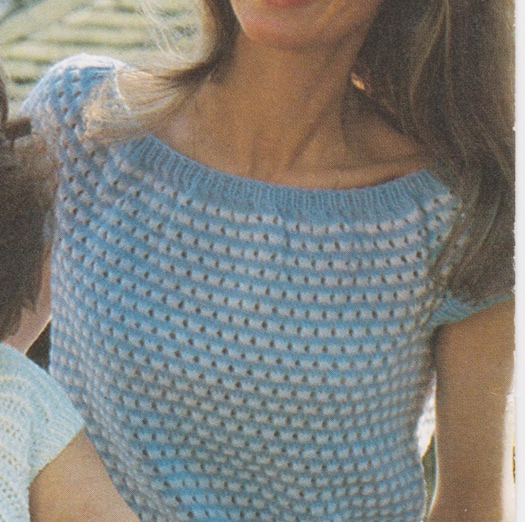 This has a wide, round neck. The body design is of alternating, horizontal, blue & white stripes. All the white stripes have small, lacy holes, equidistant but slightly offset to its neigbouring white stripe. This gives an almost triangular or pyramid style to the design. Like the white top, the blue & white top has integrated cap sleeves, knitted the same time as knitting the top portion of the sweater.