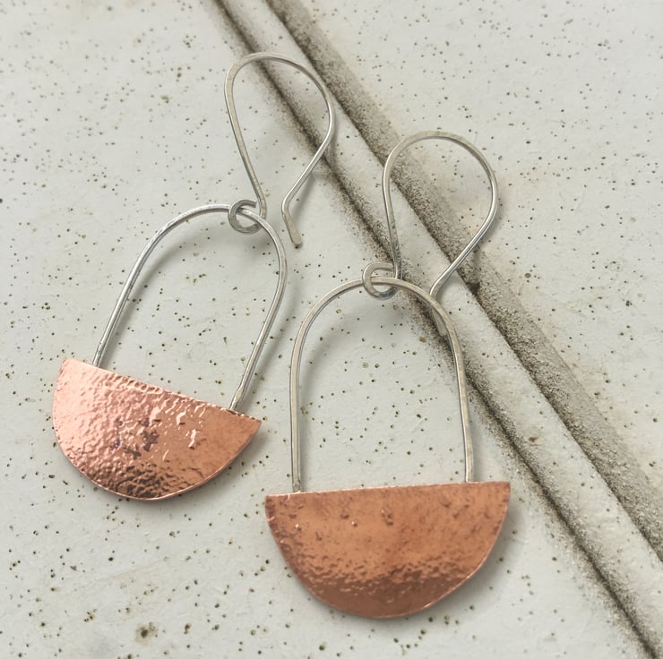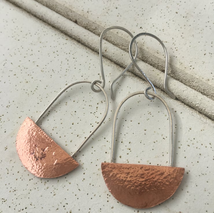Semi circles of copper, hammer battered to give a lovely light reflective texture, suspended from arcs of sterling silver and finished with hand forged sterling silver ear wires.