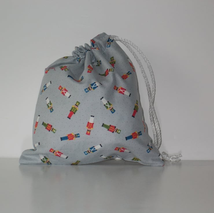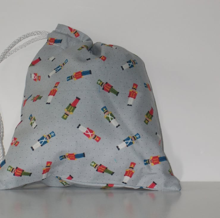 The print on this bag is of tin solders in blue, green and red on a grey background with a drawstring.