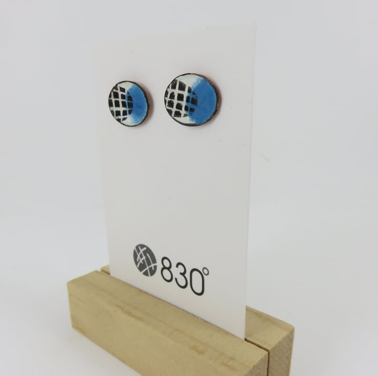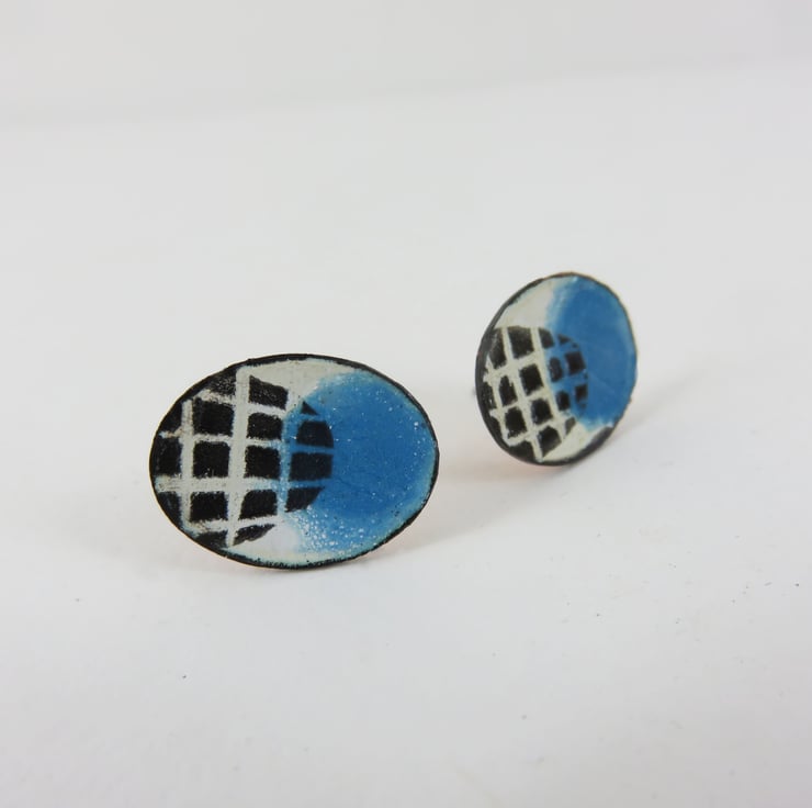 Oval copper studs 15mm wide by 10mm high with silver posts and butterfly backs. Layers of white enamel are laid down first and fired in the kiln. A splodge of turquoise enamel is added. Finally a layer of black enamel is painted on and lines drawn through to reveal the enamel beneath.