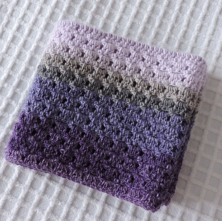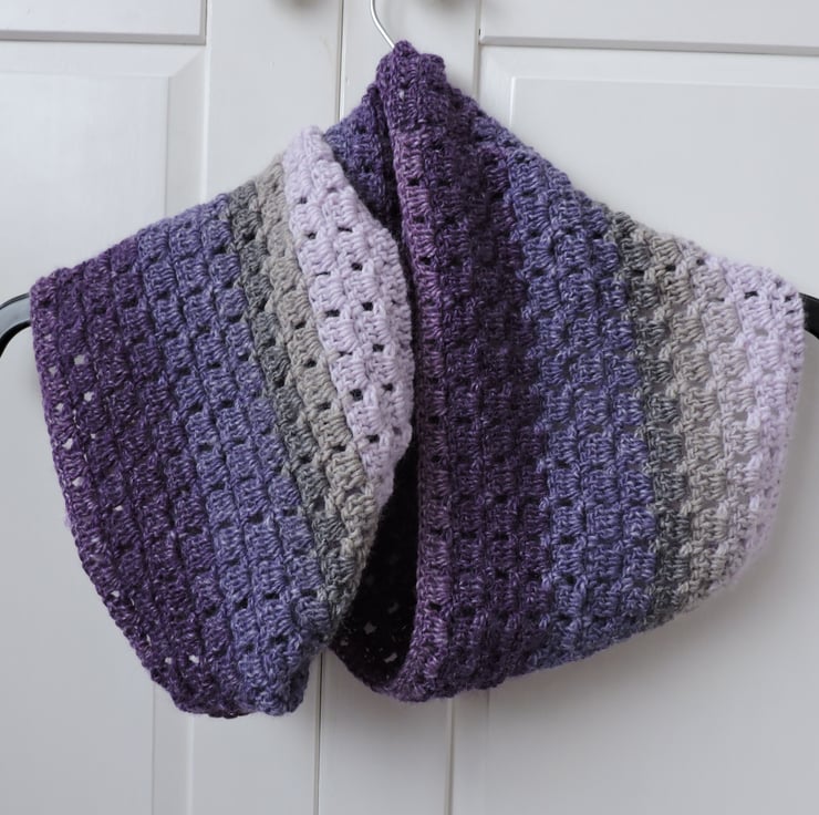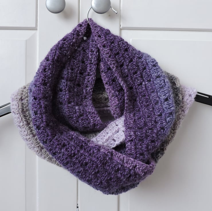 I've crocheted this infinity scarf in a beautifully soft double knit acrylic multi tonal yarn. This yarn graduates through purple, lavender, and pale pink with a touch of grey and white .