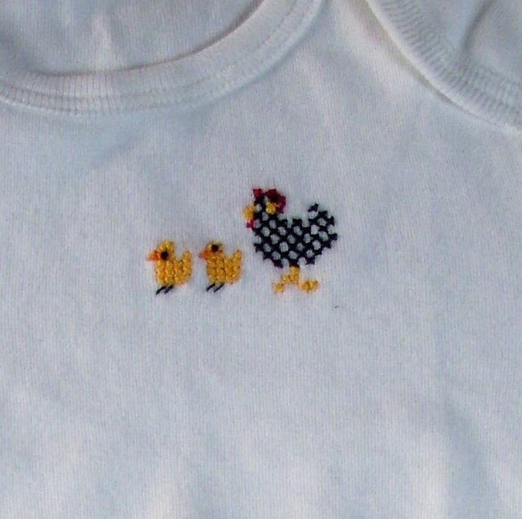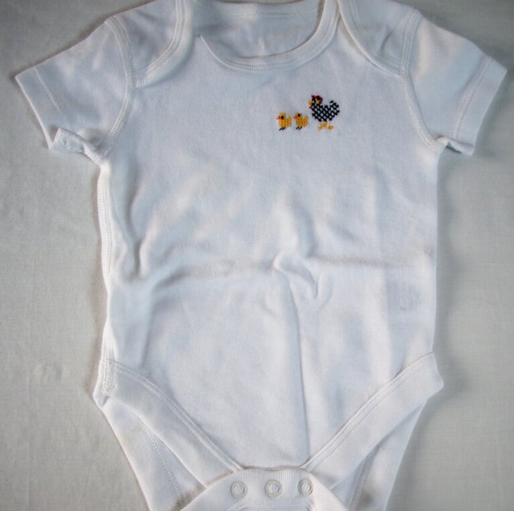 I have made this plain white baby vest/onesie special by hand stitching a black and white hen and her two golden yellow chicks on the front. The vest has an envelope neck, short sleeves and three press studs between the legs. It is 100% cotton and can be machine washed.
