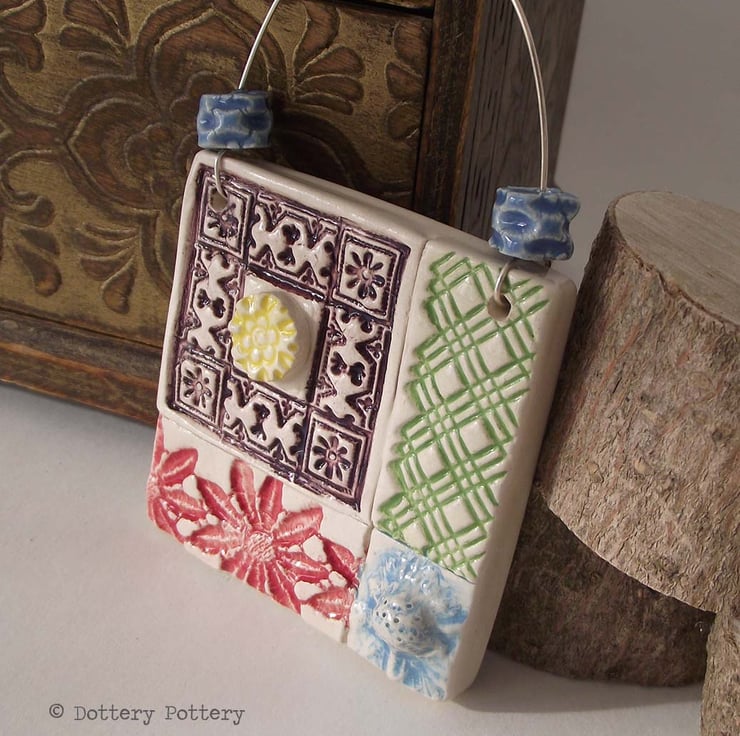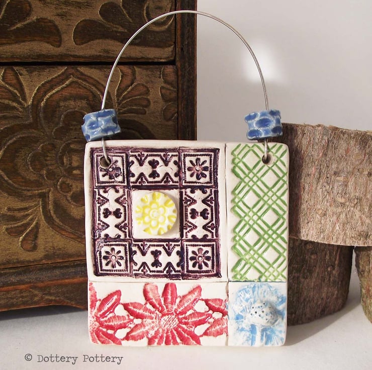 This intricately patterned ceramic tile is made from white earthenware clay and decorated with a patchwork floral design.