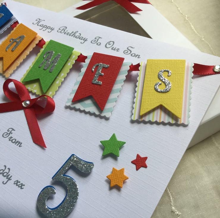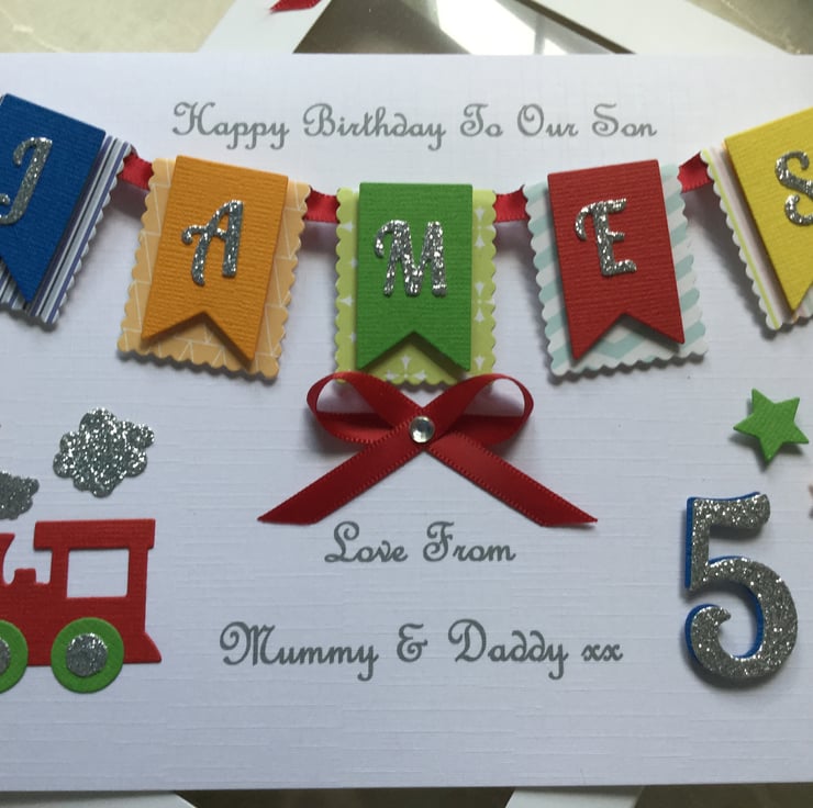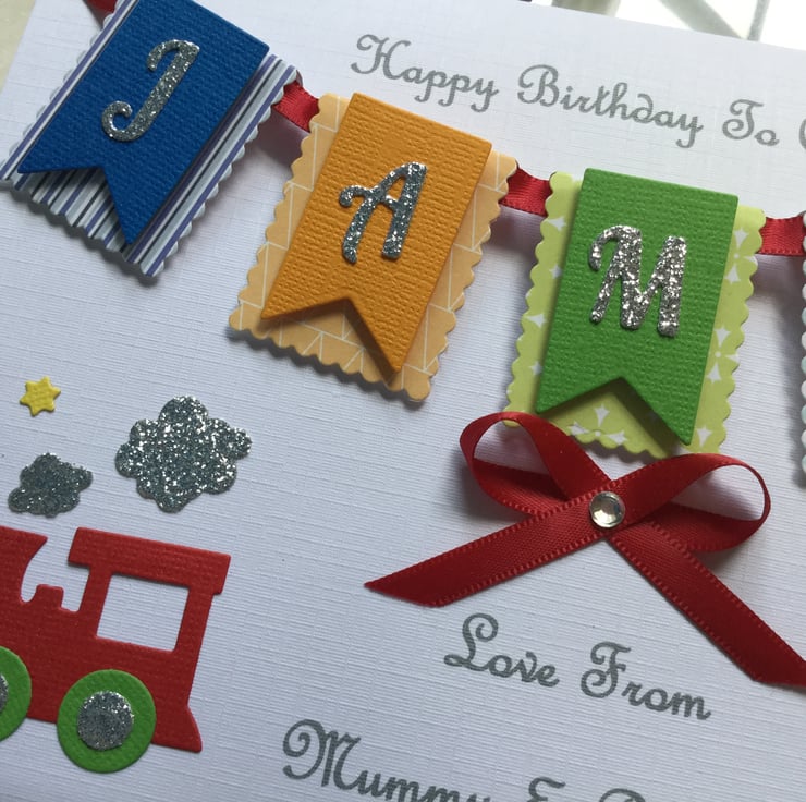 This handmade personalised card is A5 in size ( 210mm x 150mm) and is on 300gsm heavyweight linen cardstock. This multi-coloured bunting card can be made for any little boy’s special occasion and can be for any age. I can fit up to seven letters on the bunting. The card is embellished with ribbons and gems.