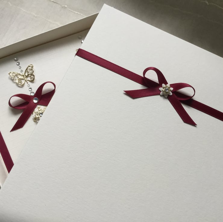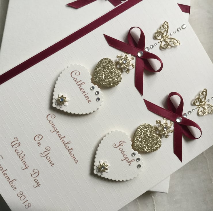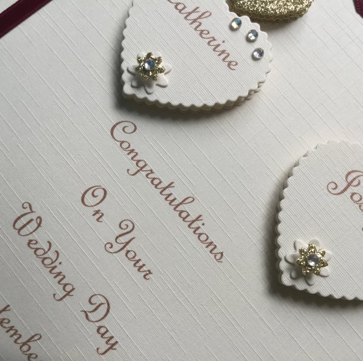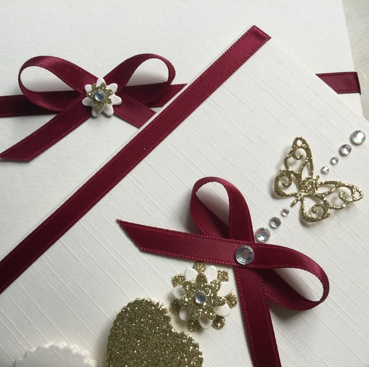 This handmade personalised card is A5 in size ( 210mm x 150mm) and is on 300gsm heavyweight ivory linen cardstock. This card can be for a wedding day, engagement, any anniversary or any special occasion for a couple. This ivory and gold hearts card is embellished with ribbons and gems.
