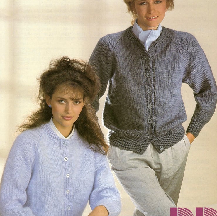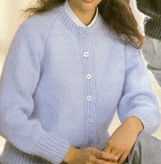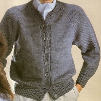 This is the pattern you should have in your collection if you are, or want to become, a seasoned knitter. A very plain, round necked cardigan with buttons down the front for closure. This pattern also showcases raglan sleeves – a ‘must have’ skill if you are looking to be a serious knitwear designer/maker. This pattern will form the base of almost all cardigans, with the tiny tweek of making it a V-neck, or shorter sleeved variety.